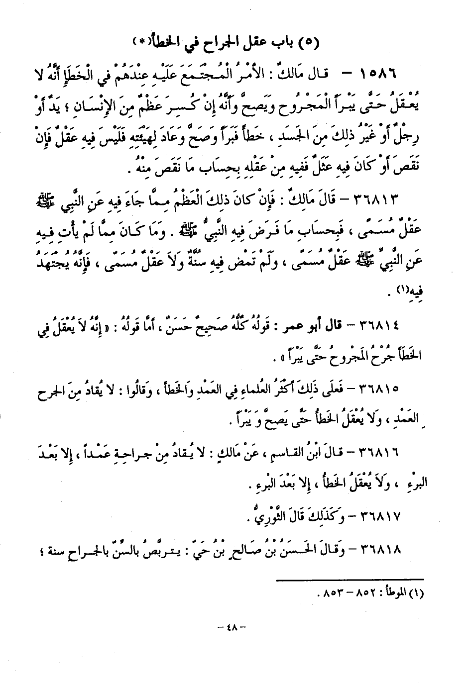 36813 - قَالَ مَالِكٌ: فَإِنْ كَانَ ذَلِكَ الْعَظْمُ مِمَّا جَاءَ فِيهِ عَنِ النَّبِيِّ - صَلَّى اللَّهُ عَلَيْهِ وَسَلَّمَ - عَقْلٌ مُسَمًّى، فَبِحِسَابِ مَا فَرَضَ فِيهِ النَّبِيُّ - صَلَّى اللَّهُ عَلَيْهِ وَسَلَّمَ -. وَمَا كَانَ مِمَّا لَمْ يَأْتِ فِيهِ عَنِ النَّبِيِّ - صَلَّى اللَّهُ عَلَيْهِ وَسَلَّمَ - عَقْلٌ مُسَمًّى، وَلَمْ تَمْضِ فِيهِ سُنَّةٌ وَلَا عَقْلٌ مُسَمًّي، فَإِنَّهُ يَجْتَهِدُ فِيهِ.