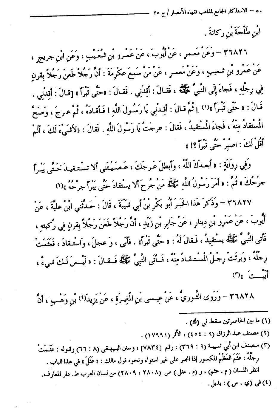 36826 - وَعَنْ مَعْمَرٍ، عَنْ أَيُّوبَ، عَنْ عَمْرِو بْنِ شُعَيْبٍ، وَعَنِ ابْنِ جُرَيْجٍ، عَنْ عَمْرِو بْنِ شُعَيْبٍ، وَعَنْ مَعْمَرٍ، عَنْ مَنْ سَمِعَ عِكْرِمَةَ:أَنَّ رَجُلًا طَعَنَ رَجُلًا بِقَرْنٍ فِي رِجْلِهِ، فَجَاءَ إِلَى النَّبِيِّ - صَلَّى اللَّهُ عَلَيْهِ وَسَلَّمَ -، فَقَالَ: أَقِدْنِي. فَقَالَ: " حَتَّى تَبْرَأَ " قَالَ: أَقِدْنِي قَالَ: " حَتَّى تَبْرَأَ " ثُمَّ قَالَ: أَقِدْنِي يَا رَسُولَ اللَّهِ ! فَأَقَادَهُ، ثُمَّ عَرَجَ، وَصَحَّ الْمُسْتَقَادُ مِنْهُ، فَجَاءَ الْمُسْتَقِيدُ، فَقَالَ: عَرَجْتُ يَا رَسُولَ اللَّهِ، فَقَالَ: " لَا شَيْءَ لَكَ، أَلَمْ أَقُلْ لَكَ: اصْبِرْ حَتَّى تَبْرَأَ ؟ ! " وَفِي رِوَايَةٍ: " أَبْعَدَكَ اللَّهُ، وَأَبْطَلَ عَرَجَكَ، عَصَيْتَنِي أَلَّا تَسْتَقِيدَ حَتَّى يَبْرَأَ جُرْحُكَ " ثُمَّ: " أَمَرَ رَسُولُ اللَّهِ - صَلَّى اللَّهُ عَلَيْهِ وَسَلَّمَ - مَنْ جُرِحَ أَلَّا يُسْتَقَادَ حَتَّى يَبْرَأَ جُرْحُهُ ".