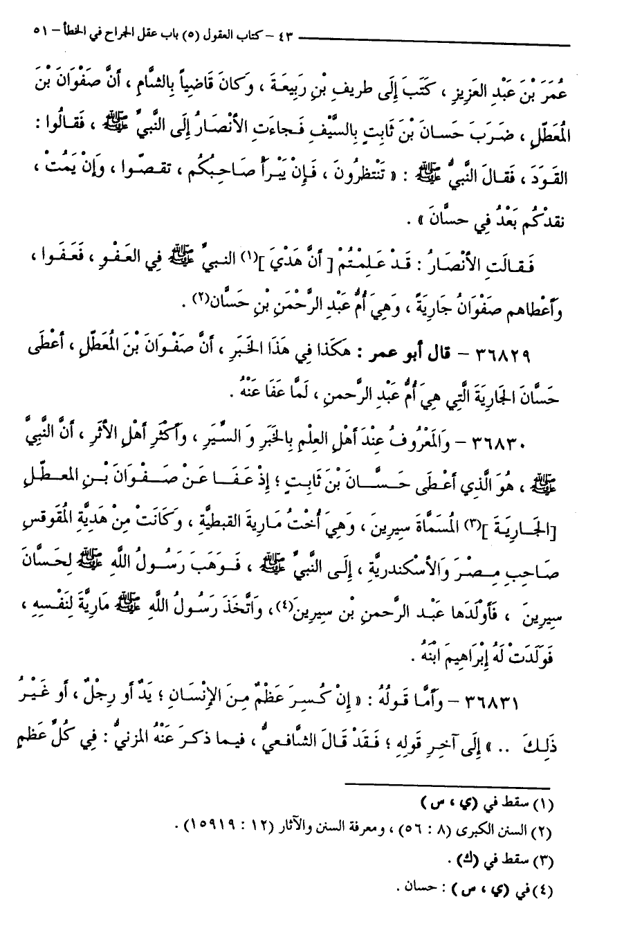 أَنَّ عُمَرَ بْنَ عَبْدِ الْعَزِيزِ، كَتَبَ إِلَى طَرِيفِ بْنِ رَبِيعَةَ، وَكَانَ قَاضِيًا بِالشَّامِ،أَنَّ صَفْوَانَ بْنَ الْمُعَطَّلِ، ضَرَبَ حَسَّانَ بْنَ ثَابِتٍ بِالسَّيْفِ فَجَاءَتِ الْأَنْصَارُ إِلَى النَّبِيِّ - صَلَّى اللَّهُ عَلَيْهِ وَسَلَّمَ -، فَقَالُوا: الْقَوَدَ، فَقَالَ النَّبِيُّ - صَلَّى اللَّهُ عَلَيْهِ وَسَلَّمَ -: " تَنْتَظِرُونَ، فَإِنْ يَبْرَأْ صَاحِبُكُمْ، تُقَصُّوا، وَإِنْ يَمُتْ، نُقِدْكُمْ بَعْدُ فِي حَسَّانَ ". فَقَالَتِ الْأَنْصَارُ: قَدْ عَلِمْتُمْ أَنَّ هَدْيَ النَّبِيِّ - صَلَّى اللَّهُ عَلَيْهِ وَسَلَّمَ - فِي الْعَفْوِ، فَعَفَوْا، وَأَعْطَاهُمْ صَفْوَانُ جَارِيَةً، وَهِيَ أُمُّ عَبْدِ الرَّحْمَنِ بْنِ حَسَّانَ.
