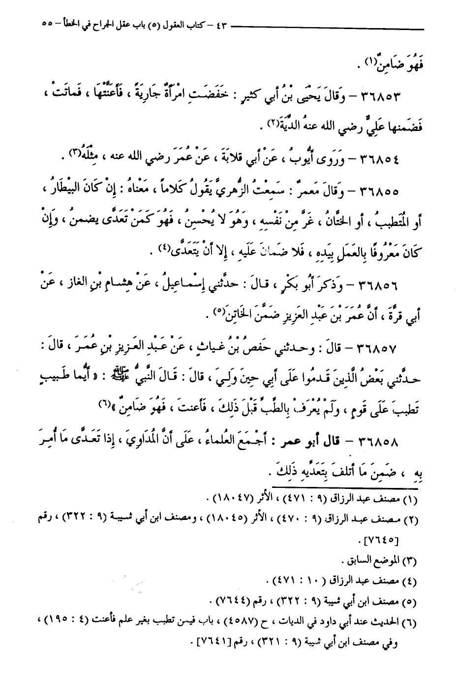36857 - قَالَ: وَحَدَّثَنِي حَفْصُ بْنُ غِيَاثٍ، عَنْ عَبْدِ الْعَزِيزِ بْنِ عُمَرَ، قَالَ: حَدَّثَنِي بَعْضُ الَّذِينَ قَدِمُوا عَلَى أَبِي حِينَ وُلِّيَ، قَالَ: قَالَ النَّبِيُّ - صَلَّى اللَّهُ عَلَيْهِ وَسَلَّمَ -: "أَيُّمَا طَبِيبٍ تَطَبَّبَ عَلَى قَوْمٍ، وَلَمْ يُعْرَفْ بِالطِّبِّ قَبْلَ ذَلِكَ، فَأَعَنْتَ، فَهُوَ ضَامِنٌ ".