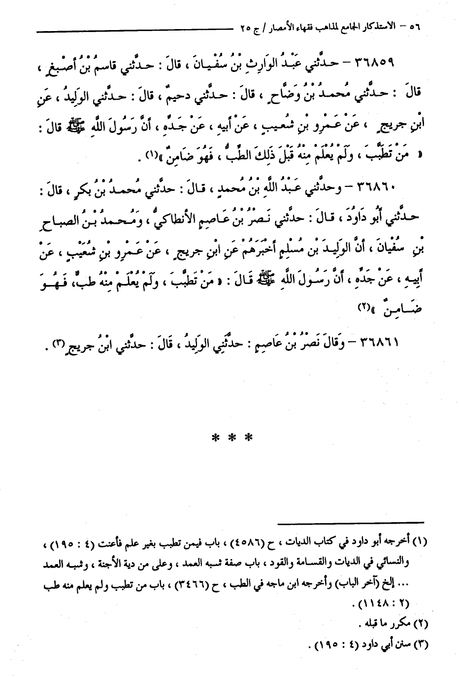 36859 - حَدَّثَنِي عَبْدُ الْوَارِثِ بْنُ سُفْيَانَ، قَالَ: حَدَّثَنِي قَاسِمُ بْنُ أَصْبَغَ قَالَ: حَدَّثَنِي مُحَمَّدُ بْنُ وَضَّاحٍ، قَالَ: حَدَّثَنِي دُحَيْمٌ، قَالَ: حَدَّثَنِي الْوَلِيدُ، عَنِ ابْنِ جُرَيْجٍ، عَنْ عَمْرِو بْنِ شُعَيْبٍ، عَنْ أَبِيهِ، عَنْ جَدِّهِ، أَنَّ رَسُولَ اللَّهِ - صَلَّى اللَّهُ عَلَيْهِ وَسَلَّمَ - قَالَ: "مَنْ تَطَبَّبَ، وَلَمْ يُعْلَمْ مِنْهُ قَبْلَ ذَلِكَ الطِّبُّ، فَهُوَ ضَامِنٌ ".