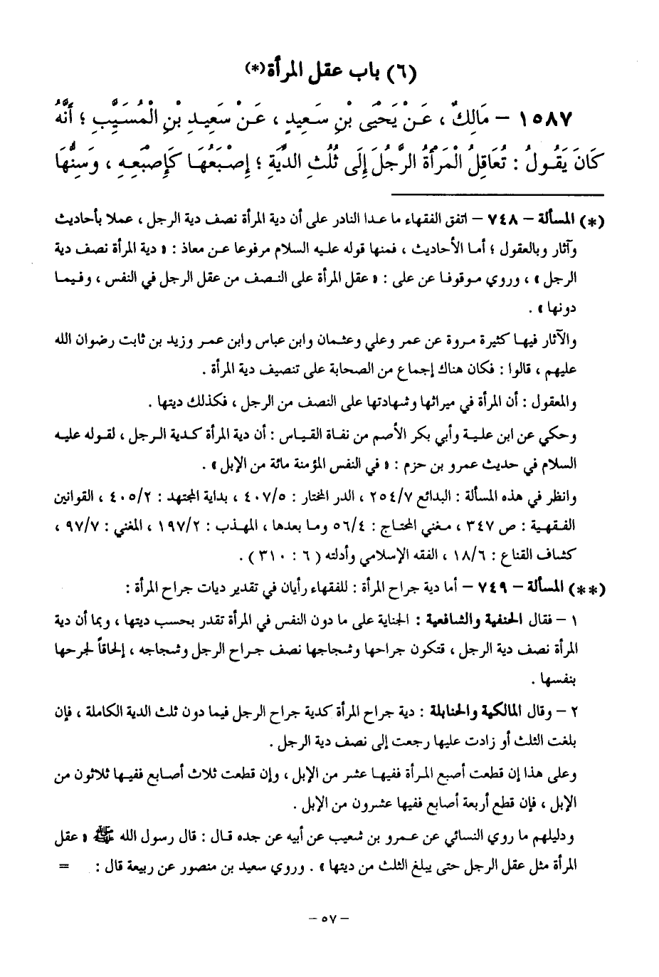 1587 - مَالِكٌ، عَنْ يَحْيَى بْنِ سَعِيدٍ، عَنْ سَعِيدِ بْنِ الْمُسَيَّبِ، أَنَّهُ كَانَ يَقُولُ: تُعَاقِلُ الْمَرْأَةُ الرَّجُلَ إِلَى ثُلُثِ الدِّيَةِ، إِصْبَعُهَا كَإِصْبَعِهِ، وَسِنُّهَا