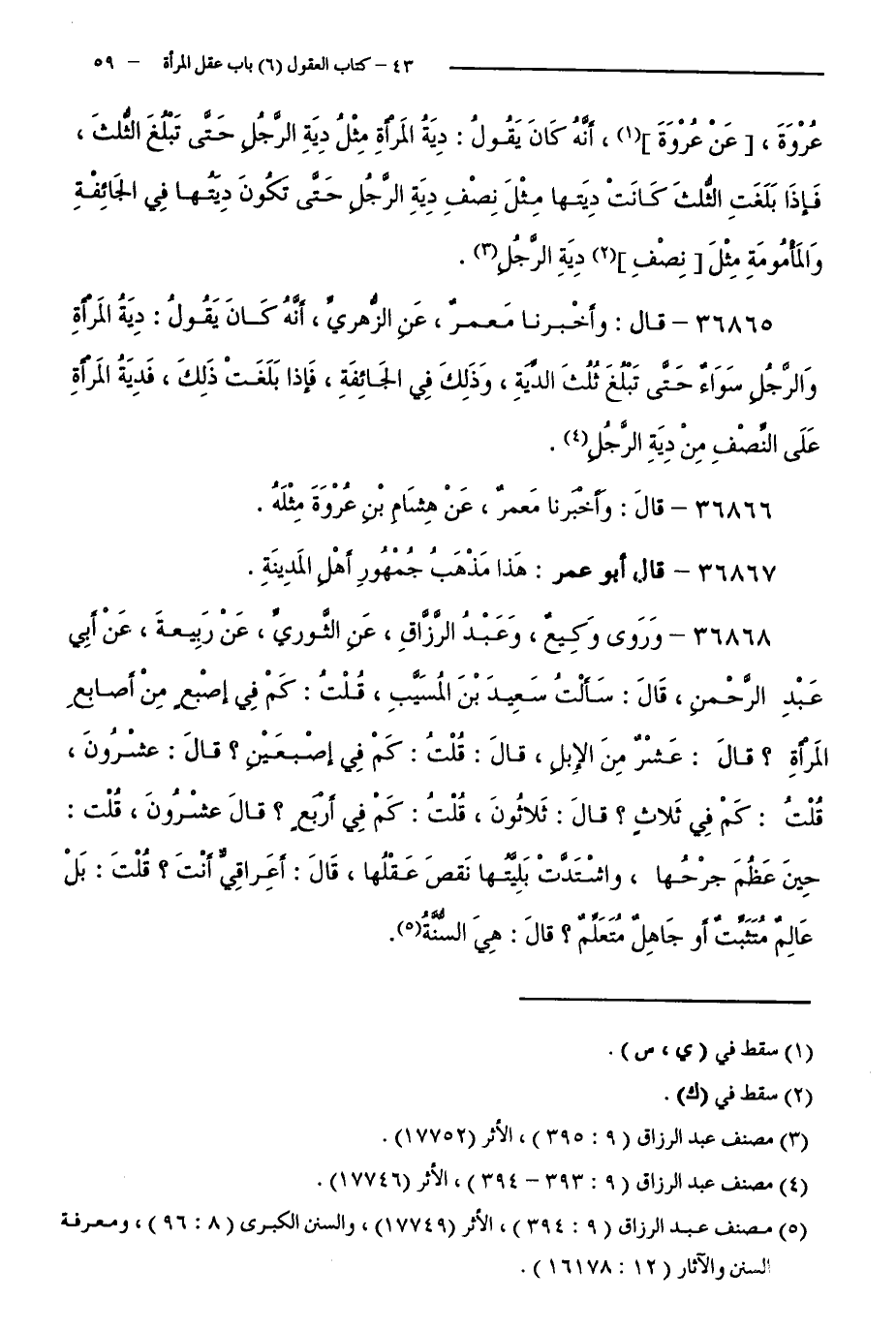 36865 - قَالَ: وَأَخْبَرَنَا مَعْمَرٌ، عَنِ الزُّهْرِيِّ، أَنَّهُ كَانَ يَقُولُ: دِيَةُ الْمَرْأَةِ وَالرَّجُلِ سَوَاءٌ حَتَّى تَبْلُغَ ثُلْثَ الدِّيَةِ، وَذَلِكَ فِي الْجَائِفَةِ، فَإِذَا بَلَغَتْ ذَلِكَ، فَدِيَةُ الْمَرْأَةِ عَلَى النِّصْفِ مِنْ دِيَةِ الرَّجُلِ.