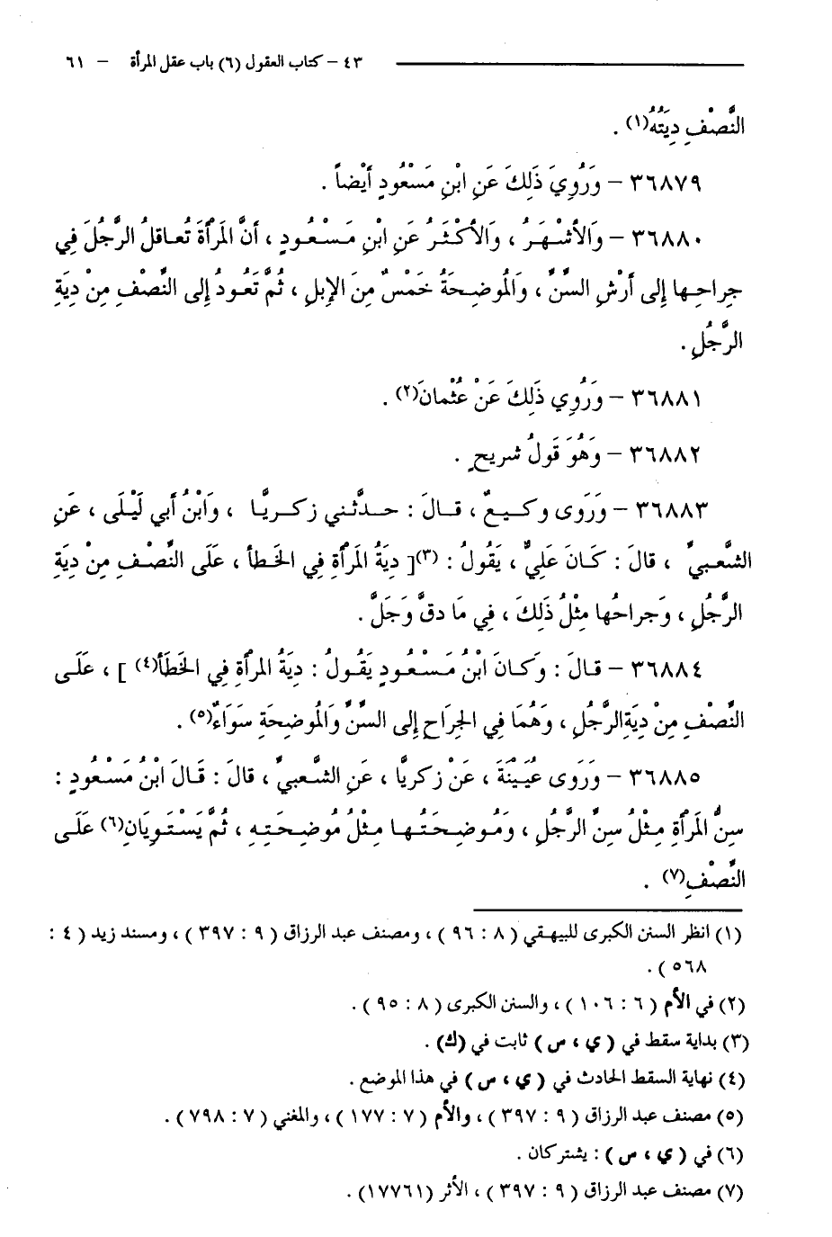 36884 - قَالَ: وَكَانَ ابْنُ مَسْعُودٍ يَقُولُ: دِيَةُ الْمَرْأَةِ فِي الْخَطَأِ ]، عَلَى النِّصْفِ مِنْ دِيَةِ الرَّجُلِ، وَهُمَا فِي الْجِرَاحِ إِلَى السِّنِّ وَالْمُوضَحَةِ سَوَاءٌ.