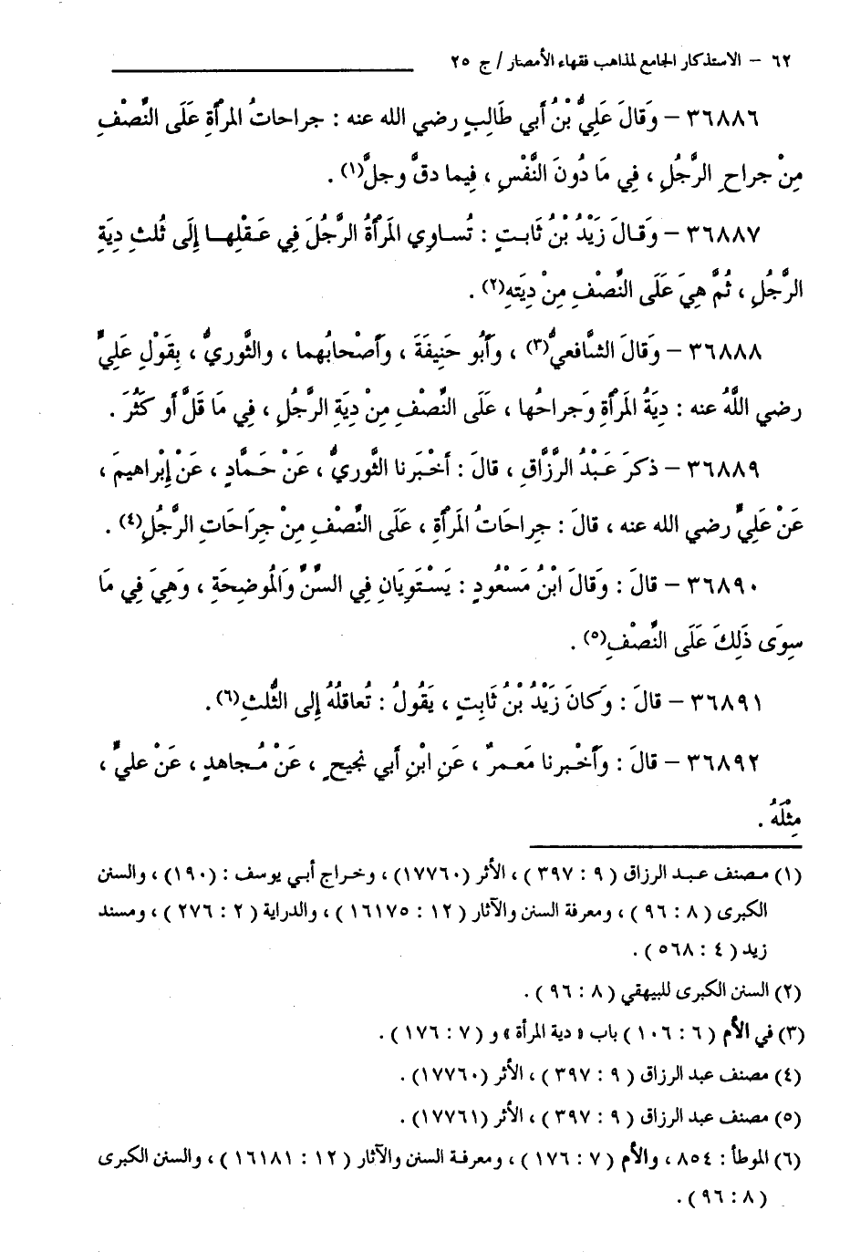 36886 - وَقَالَ عَلِيُّ بْنُ أَبِي طَالِبٍ - رَضِيَ اللَّهُ عَنْهُ: جِرَاحَاتُ الْمَرْأَةِ عَلَى النِّصْفِ مِنْ جِرَاحِ الرَّجُلِ، فِي مَا دُونَ النَّفْسِ، فِيمَا دَقَّ وَجَلَّ.