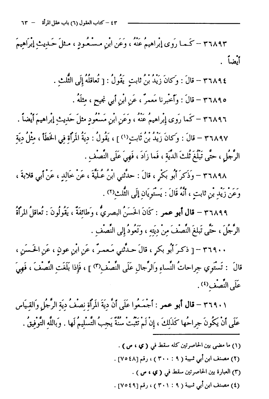 36899 - قَالَ أَبُو عُمَرَ: كَانَ الْحَسَنُ الْبَصْرِيُّ، وَطَائِفَةٌ، يَقُولُونَ: تُعَاقِلُ الْمَرْأَةُ الرَّجُلَ، حَتَّى تَبْلُغَ النِّصْفَ مِنْ دِيَتِهِ، وَتَعُودَ إِلَى النِّصْفِ.