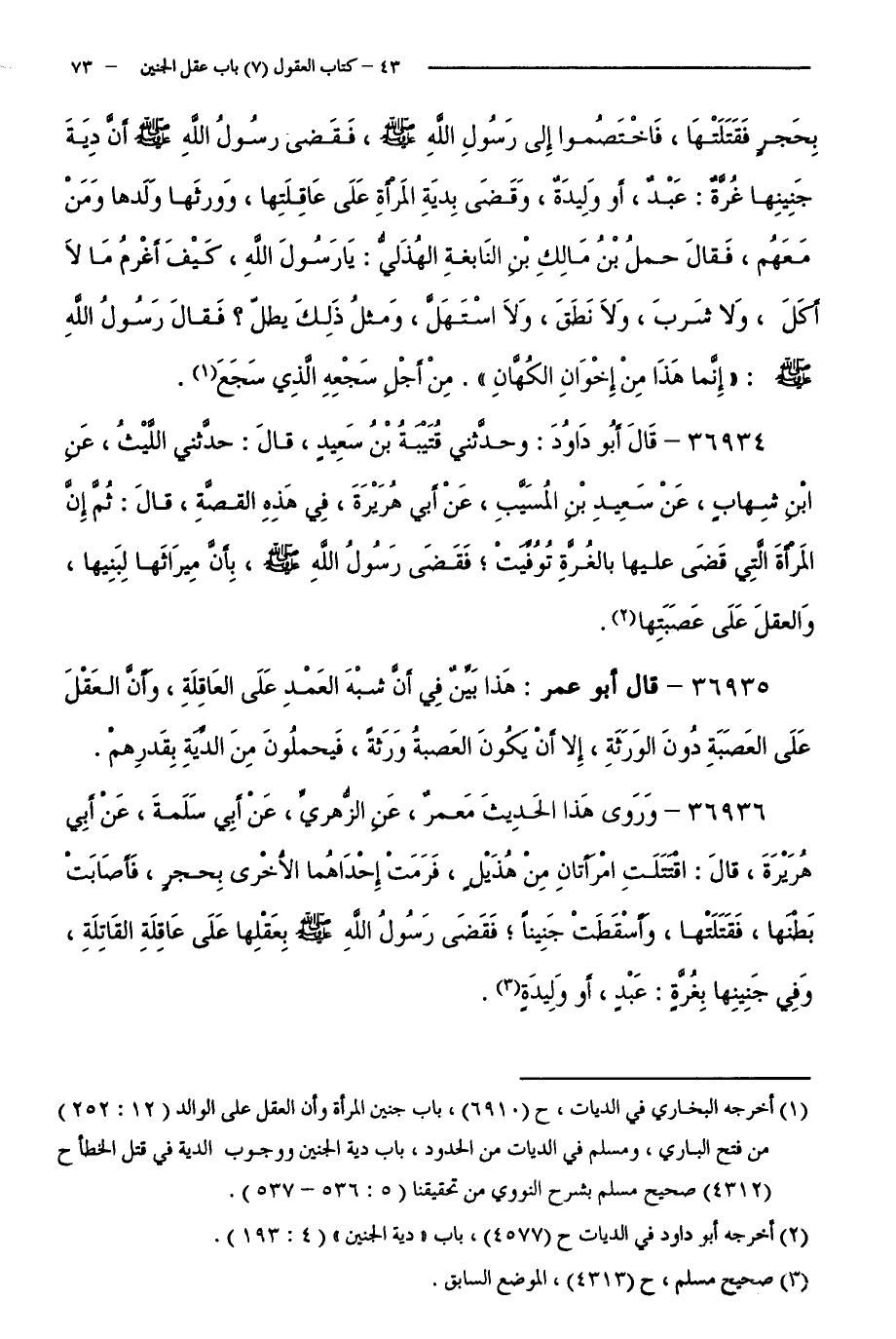 36934 - قَالَ أَبُو دَاوُدَ: وَحَدَّثَنِي قُتَيْبَةُ بْنُ سَعِيدٍ: قَالَ: حَدَّثَنِي اللَّيْثُ، عَنِ ابْنِ شِهَابٍ، عَنْ سَعِيدِ بْنِ الْمُسَيَّبِ، عَنْ أَبِي هُرَيْرَةَ، فِي هَذِهِ الْقِصَّةِ، قَالَ:ثُمَّ إِنَّ الْمَرْأَةَ الَّتِي قَضَى عَلَيْهَا بِالْغُرَّةِ تُوُفِّيَتْ: فَقَضَى رَسُولُ اللَّهِ - صَلَّى اللَّهُ عَلَيْهِ وَسَلَّمَ - بِأَنَّ مِيرَاثَهَا لِبَنِيهَا، وَالْعَقْلَ عَلَى عَصَبَتِهَا.