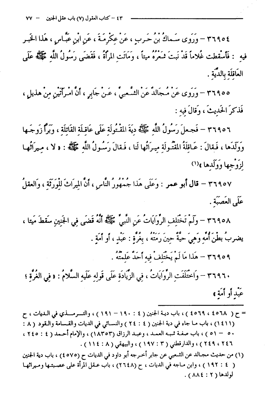 36958 - وَلَمْ تَخْتَلِفِ الرِّوَايَاتُ عَنِ النَّبِيِّ - صَلَّى اللَّهُ عَلَيْهِ وَسَلَّمَ - أَنَّهُ قَضَى فِي الْجَنِينِ سَقَطَ مَيِّتًا، يَضْرِبُ بَطْنَ أُمِّهِ وَهِيَ حَيَّةٌ حِينَ رَمَتْهُ، بِغُرَّةٍ: عَبْدٍ، أَوْ أَمَةٍ.
