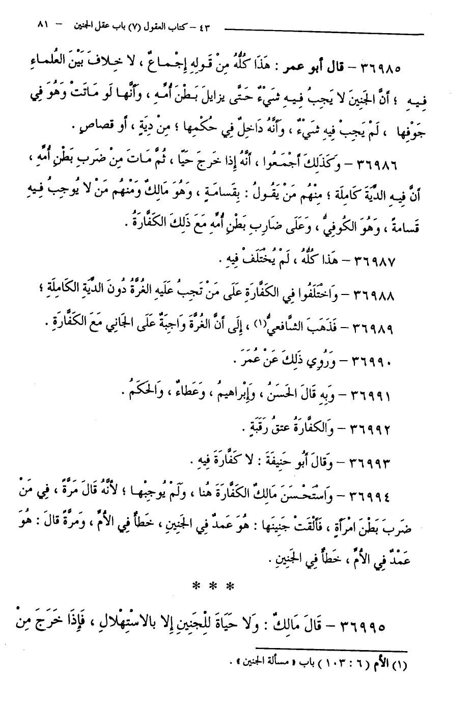 36985 - قَالَ أَبُو عُمَرَ: هَذَا كُلُّهُ مِنْ قَوْلِهِ إِجْمَاعٌ، وَلَا خِلَافَ بَيْنِ الْعُلَمَاءِ فِيهِ، أَنَّ الْجَنِينَ لَا يَجِبُ فِيهِ شَيْءٌ حَتَّى يُزَايِلَ بَطْنَ أُمِّهِ، وَأَنَّهَا لَوْ مَاتَتْ وَهُوَ فِي جَوْفِهَا، لَمْ يَجِبْ فِيهِ شَيْءٌ، وَأَنَّهُ دَاخِلٌ فِي حُكْمِهَا، مِنْ دِيَةٍ أَوْ قِصَاصٍ.