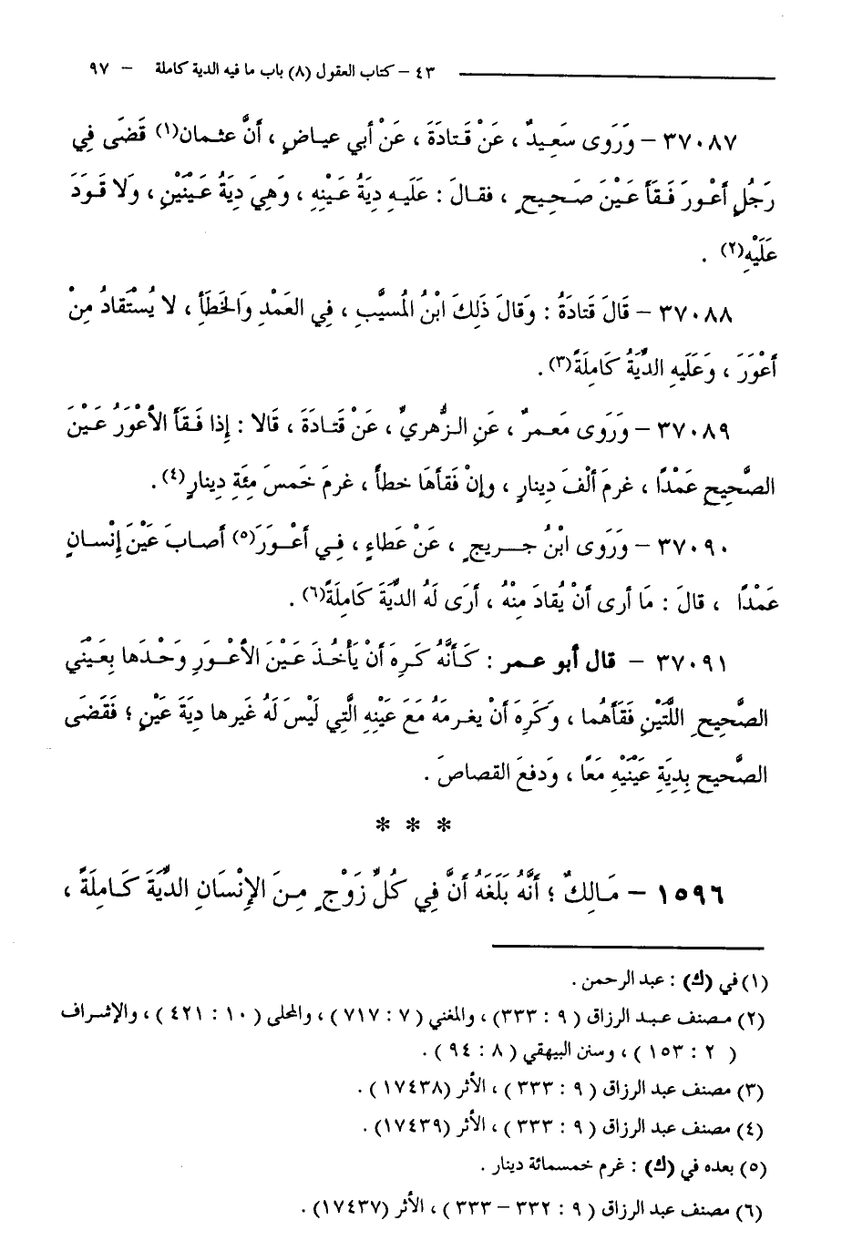 37088 - قَالَ قَتَادَةُ: وَقَالَ ذَلِكَ ابْنُ الْمُسَيَّبِ، فِي الْعَمْدِ وَالْخَطَأِ، لَا يُسْتَقَادُ مِنْ أَعْوَرَ، وَعَلَيْهِ الدِّيَةُ كَامِلَةً.
