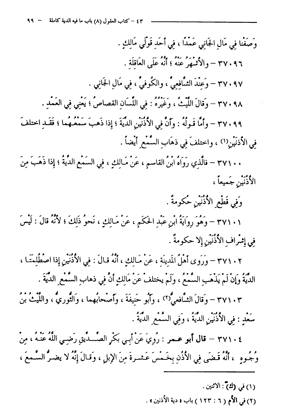 37103 - وَقَالَ الشَّافِعِيُّ، وَأَبُو حَنِيفَةَ، وَأَصْحَابُهُمَا، وَالثَّوْرِيُّ، وَاللَّيْثُ بْنُ سَعْدٍ: فِي الْأُذُنَيْنِ الدِّيَةُ، وَفِي السَّمْعِ الدِّيَةُ.