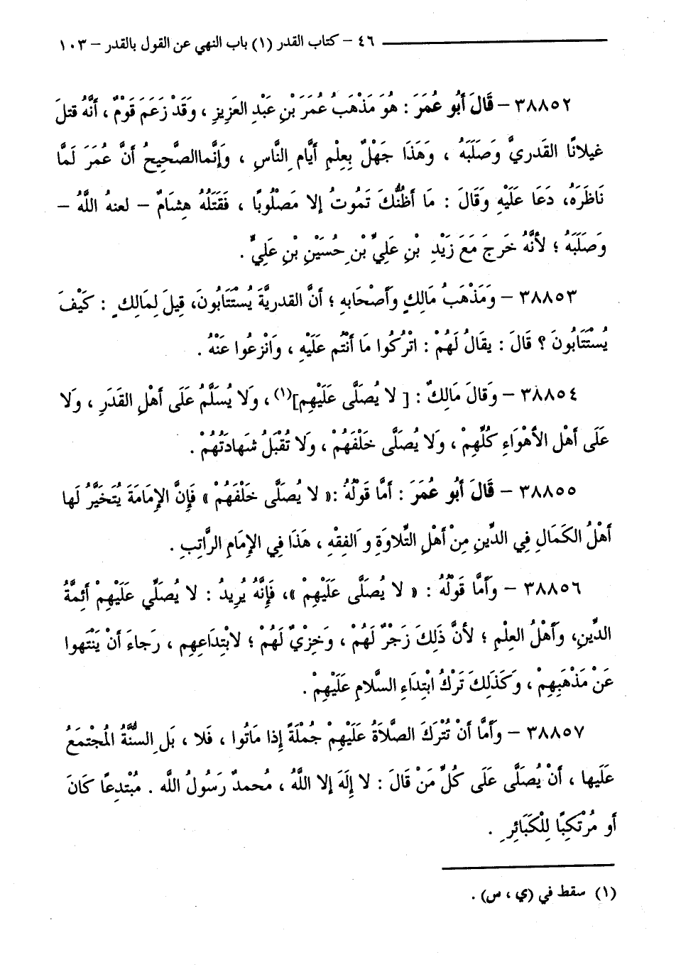 38854 - وَقَالَ مَالِكٌ: لَا يُصَلَّى عَلَيْهِمْ، وَلَا يُسَلَّمُ عَلَى أَهْلِ الْقَدَرِ، وَلَا عَلَى أَهْلِ الْأَهْوَاءِ كُلِّهِمْ، وَلَا يُصَلَّى خَلْفَهُمْ، وَلَا تُقْبَلُ شَهَادَتُهُمْ.