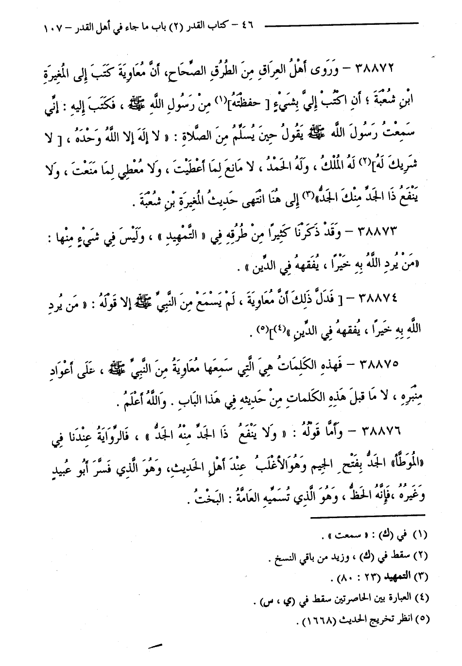 38872 - وَرَوَى أَهْلُ الْعِرَاقِ مِنَ الطُّرُقِ الصِّحَاحِ،أَنَّ مُعَاوِيَةَ كَتَبَ إِلَى الْمُغِيرَةِ بْنِ شُعْبَةَ أَنِ اكْتُبْ إِلَيَّ بِشَيْءٍ حَفِظْتَهُ مِنْ رَسُولِ اللَّهِ - صَلَّى اللَّهُ عَلَيْهِ وَسَلَّمَ -، فَكَتَبَ إِلَيْهِ: إِنِّي سَمِعْتُ رَسُولَ اللَّهِ - صَلَّى اللَّهُ عَلَيْهِ وَسَلَّمَ - يَقُولُ حِينَ يُسَلِّمُ مِنَ الصَّلَاةِ: " لَا إِلَهَ إِلَّا اللَّهُ وَحْدَهُ، لَا شَرِيكَ لَهُ لَهُ الْمُلْكُ، وَلَهُ الْحَمْدُ، لَا مَانِعَ لِمَا أَعْطَيْتَ، وَلَا مُعْطِيَ لِمَا مَنَعْتَ، وَلَا يَنْفَعُ ذَا الْجَدِّ مِنْكَ الْجَدُّ ". إِلَى هُنَا انْتَهَى حَدِيثُ الْمُغِيرَةِ بْنِ شُعْبَةَ.