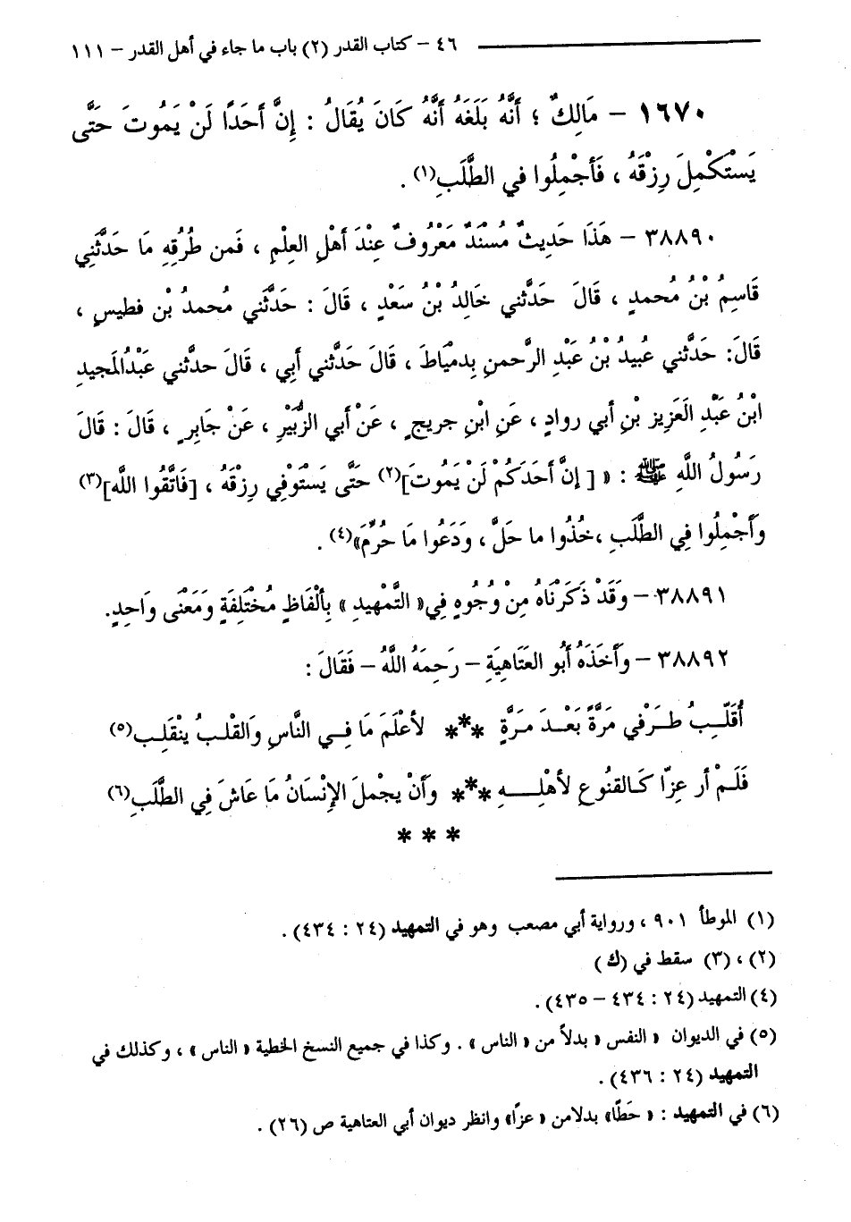 1670 - مَالِكٌ أَنَّهُ بَلَغَهُ أَنَّهُ كَانَ يُقَالُ:إِنْ أَحَدًا لَنْ يَمُوتَ حَتَّى يَسْتَكْمِلَ رِزْقَهُ، فَأَجْمِلُوا فِي الطَّلَبِ ".