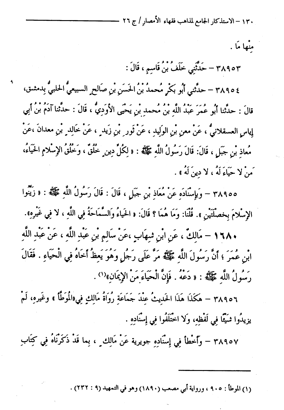 38954 - حَدَّثَنِي أَبُو بَكْرٍ مُحَمَّدُ بْنُ الْحَسَنِ بْنِ صَالِحٍ السُّبَيْعِيُّ الْحَلَبِيُّ بِدِمَشْقَ قَالَ: حَدَّثَنَا أَبُو عُمَرَ عَبْدُ اللَّهِ بْنُ مُحَمَّدِ بْنِ يَحْيَى الْأَوْدِيُّ قَالَ: حَدَّثَنَا آدَمُ بْنُ أَبِي إِيَاسٍ الْعَسْقَلَانِيُّ، عَنْ مَعْنِ بْنِ الْوَلِيدِ، عَنْ ثَوْرِ بْنِ زَيْدٍ، عَنْ خَالِدِ بْنِ مَعْدَانٍ، عَنْ مُعَاذِ بْنِ جَبَلٍ قَالَ: قَالَ رَسُولُ اللَّهِ صَلَّى اللَّهُ عَلَيْهِ وَسَلَّمَ: " لِكُلِّ دِينٍ خُلُقٌ، وَخُلُقُ الْإِسْلَامِ الْحَيَاءُ، مَنْ لَا حَيَاءَ لَهُ لَا دِينَ لَهُ ".