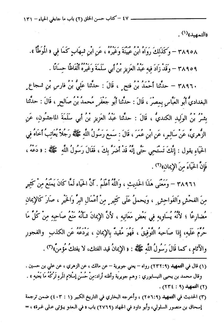 38960 - حَدَّثَنَا أَحْمَدُ بْنُ فَتْحٍ قَالَ: حَدَّثَنَا عَلِيُّ بْنُ فَارِسِ بْنِ شُجَاعٍ الْبَغْدَادِيُّ أَبُو الْعَبَّاسٍ بِمِصْرَ قَالَ: حَدَّثَنَا أَبُو جَعْفَرٍ مُحَمَّدُ بْنُ صَالِحٍ قَالَ: حَدَّثَنَا بِشْرُ بْنُ الْوَلِيدِ الْكِنْدِيُّ قَالَ: حَدَّثَنَا عَبْدُ الْعَزِيزِ بْنُ أَبِي سَلَمَةَ الْمَاجِشُونُ، عَنِ الزُّهْرِيِّ، عَنْ سَالِمٍ، عَنِ ابْنِ عُمَرَ قَالَ:سَمِعَ رَسُولُ اللَّهِ صَلَّى اللَّهُ عَلَيْهِ وَسَلَّمَ رَجُلًا يُعَاتِبُ أَخَاهُ فِي الْحَيَاءِ يَقُولُ: إِنَّكَ تَسْتَحِي حَتَّى إِنَّهُ قَدْ أَضَرَّ بِكَ، فَقَالَ رَسُولُ اللَّهِ صَلَّى اللَّهُ عَلَيْهِ وَسَلَّمَ: " دَعْهُ، فَإِنَّ الْحَيَاءَ مِنَ الْإِيمَانِ ".