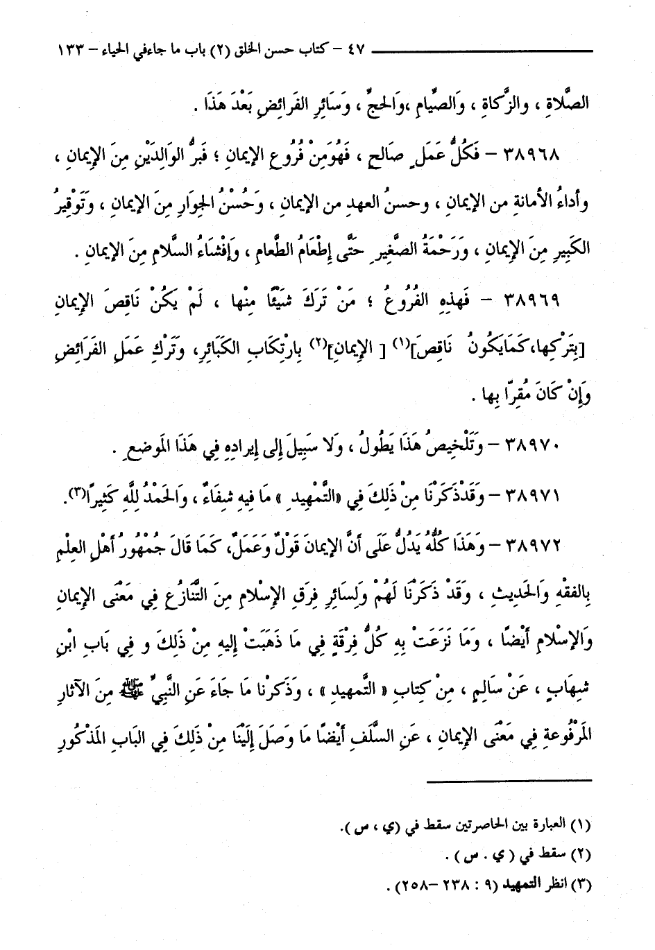 38972 - وَهَذَا كُلُّهُ يَدُلُّ عَلَى أَنَّ الْإِيمَانَ قَوْلٌ وَعَمَلٌ، كَمَا قَالَ جُمْهُورُ أَهْلِ الْعِلْمِ بِالْفِقْهِ وَالْحَدِيثِ، وَقَدْ ذَكَرْنَا لَهُمْ وَلِسَائِرِ فِرَقِ الْإِسْلَامِ مِنَ التَّنَازُعِ فِي مَعْنَى الْإِيمَانِ وَالْإِسْلَامِ أَيْضًا، وَمَا نَزَعَتْ بِهِ كُلُّ فِرْقَةٍ فِيمَا ذَهَبَتْ إِلَيْهِ مِنْ ذَلِكَ وَفِي بَابِ ابْنِ شِهَابٍ، عَنْ سَالِمٍ، مِنْ كِتَابِي " التَّمْهِيدِ "، وَذَكَرْنَا مَا جَاءَ عَنِ النَّبِيِّ صَلَّى اللَّهُ عَلَيْهِ وَسَلَّمَ مِنَ الْآثَارِ الْمَرْفُوعَةِ فِي مَعْنَى الْإِيمَانِ، عَنِ السَّلَفِ أَيْضًا مَا وَصَلَ إِلَيْنَا مِنْ ذَلِكَ فِي الْبَابِ الْمَذْكُورِ