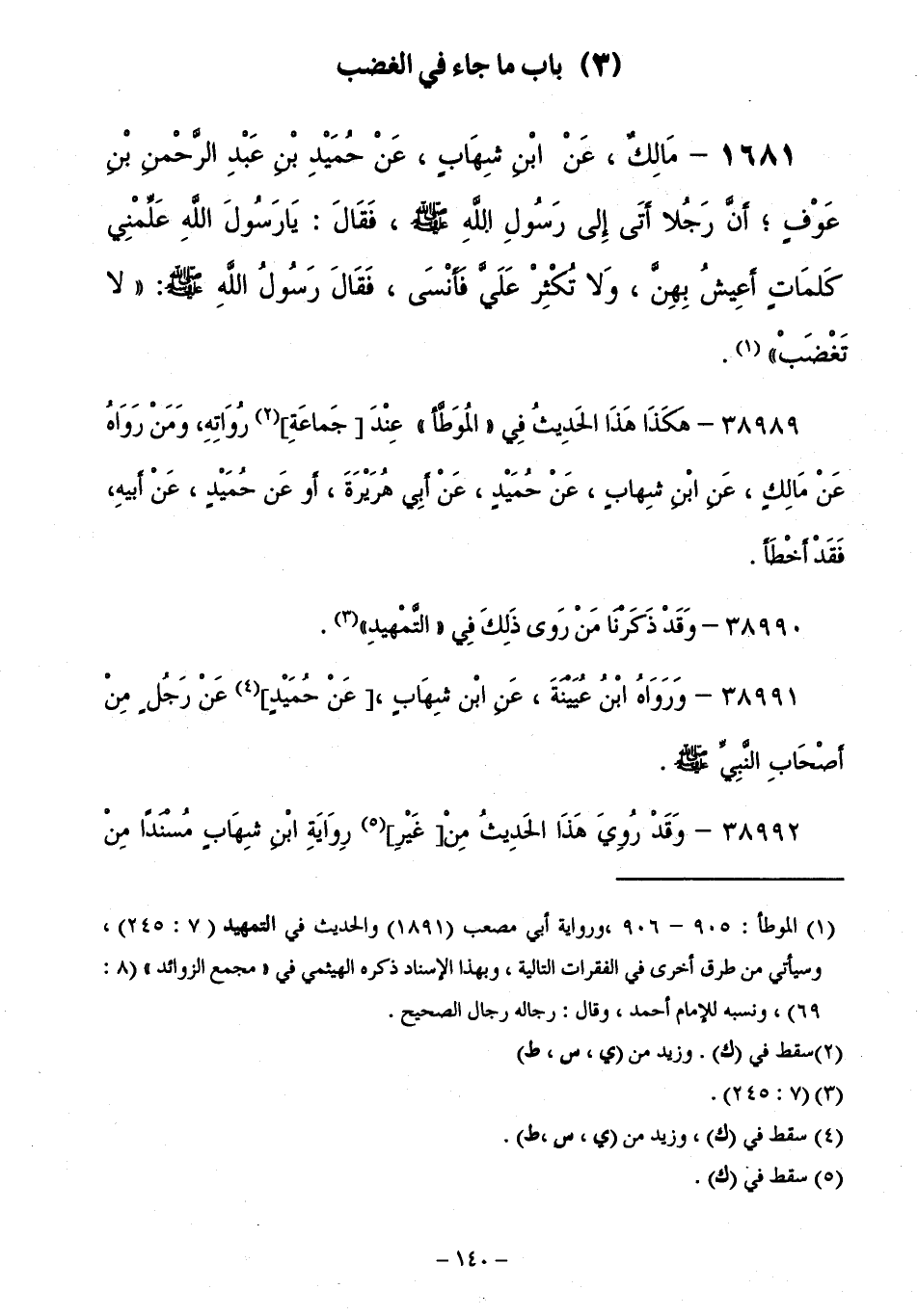 1681 - مَالِكٌ، عَنِ ابْنِ شِهَابٍ، عَنْ حُمَيْدِ بْنِ عَبْدِ الرَّحْمَنِ بْنِ عَوْفٍأَنَّ رَجُلًا أَتَى إِلَى رَسُولِ اللَّهِ صَلَّى اللَّهُ عَلَيْهِ وَسَلَّمَ، فَقَالَ: يَا رَسُولَ اللَّهِ، عَلِّمْنِي كَلِمَاتٍ أَعِيشُ بِهِنَّ، وَلَا تُكْثِرْ عَلَيَّ فَأَنْسَى، فَقَالَ رَسُولُ اللَّهِ صَلَّى اللَّهُ عَلَيْهِ وَسَلَّمَ: " لَا تَغْضَبْ ".