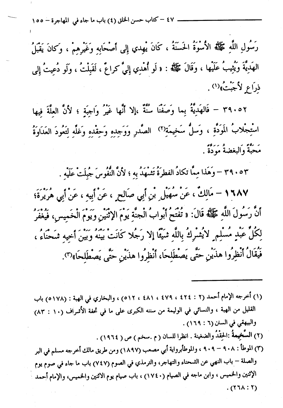 39052 - فَالْهَدِيَّةُ بِمَا وَصَفْنَا سُنَّةٌ إِلَّا أَنَّهَا غَيْرُ وَاجِبَةٍ لِأَنَّ الْعِلَّةَ فِيهَا اسْتِجْلَابُ الْمَوَدَّةِ، وَسَلُّ سَخِيمَةِ الصَّدْرِ وَوَجْدِهِ وَحِقْدِهِ وَغِلِّهِ لِتَعُودَ الْعَدَاوَةُ مَحَبَّةً وَالْبُغْضَةُ مَوَدَّةً.