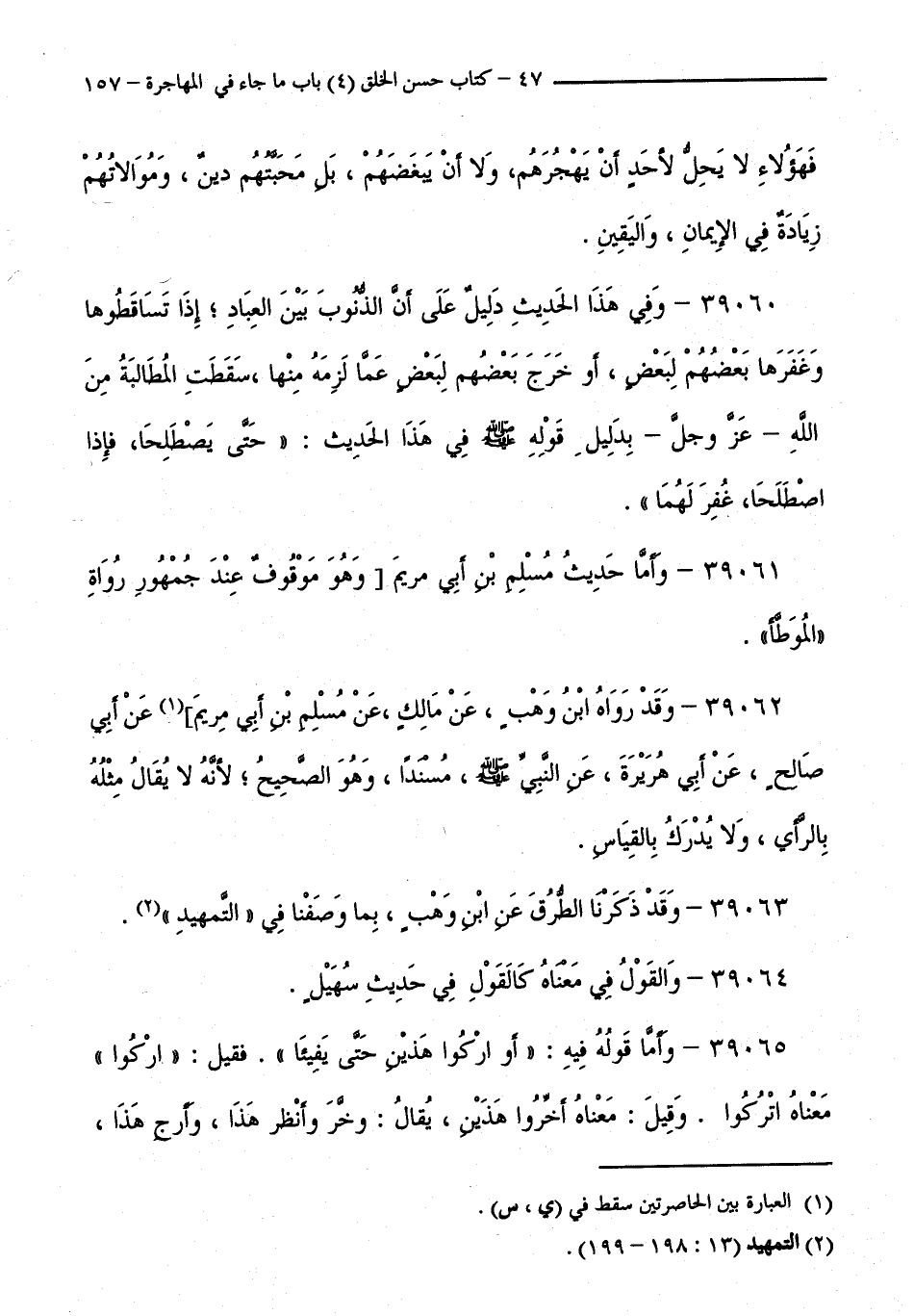 39060 - وَفِي هَذَا الْحَدِيثِ دَلِيلٌ عَلَى أَنَّ الذُّنُوبَ بَيْنَ الْعِبَادِ إِذَا تَسَاقَطُوهَا وَغَفَرَهَا بَعْضُهُمْ لِبَعْضٍ، أَوْ خَرَجَ بَعْضُهُمْ لِبَعْضٍ عَمَّا لَزِمَهُ مِنْهَا، سَقَطَتِ الْمُطَالَبَةُ مِنَ اللَّهِ - عَزَّ وَجَلَّ - بِدَلِيلِ قَوْلِهِ صَلَّى اللَّهُ عَلَيْهِ وَسَلَّمَ فِي هَذَا الْحَدِيثِ: "حَتَّى يَصْطَلِحَا، فَإِذَا اصْطَلَحَا، غُفِرَ لَهُمَا ".