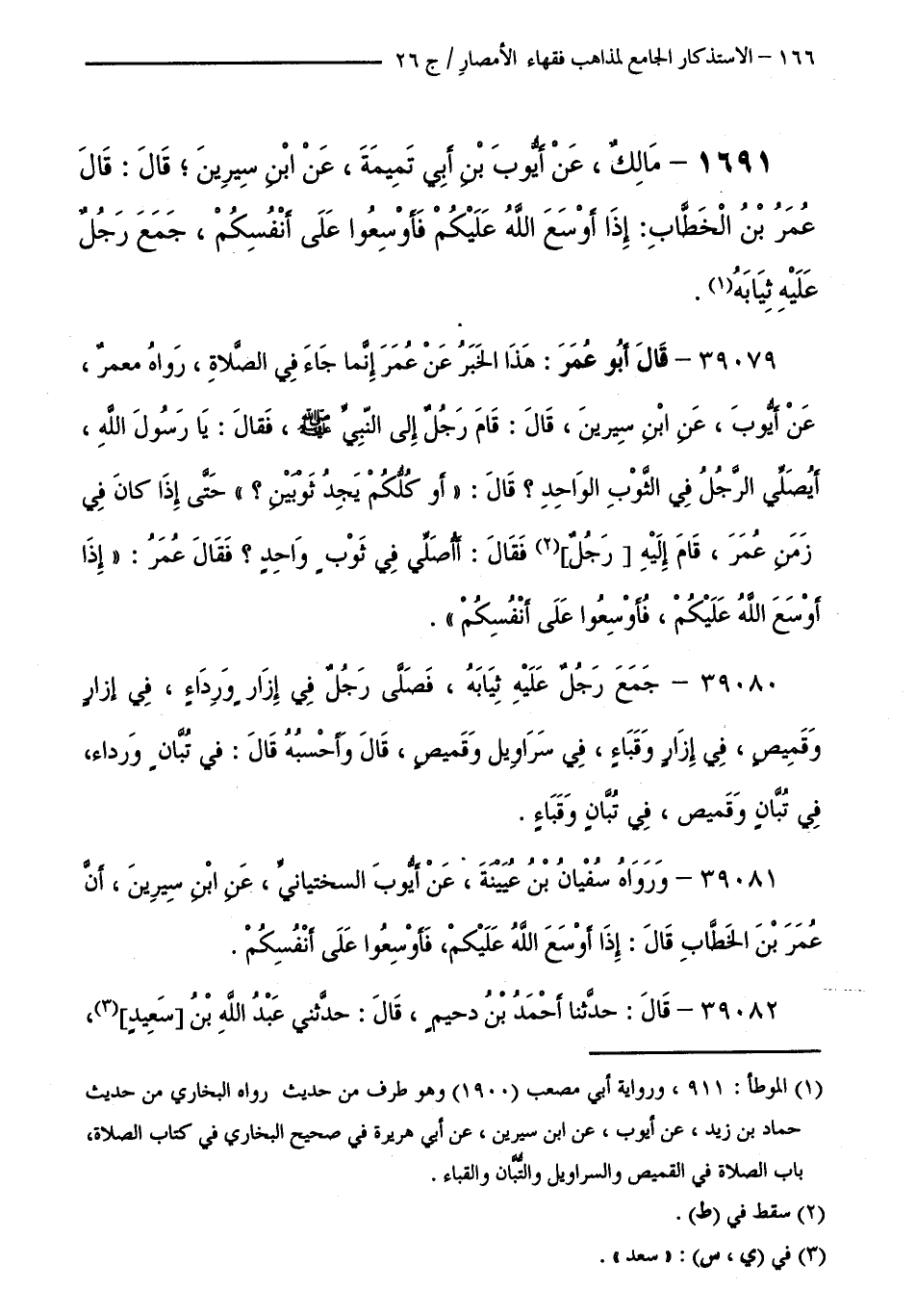 39079 - قَالَ أَبُو عُمَرَ: هَذَا الْخَبَرُ عَنْ عُمَرَ إِنَّمَا جَاءَ فِي الصَّلَاةِ، رَوَاهُ مَعْمَرٌ، عَنْ أَيُّوبَ، عَنِ ابْنِ سِيرِينَ قَالَ:قَامَ رَجُلٌ إِلَى النَّبِيِّ صَلَّى اللَّهُ عَلَيْهِ وَسَلَّمَ، فَقَالَ: يَا رَسُولَ اللَّهِ أَيُصَلِّي الرَّجُلُ فِي الثَّوْبِ الْوَاحِدِ ؟ قَالَ: " أَوَكُلُّكُمْ يَجِدُ ثَوْبَيْنِ ؟ " حَتَّى إِذَا كَانَ فِي زَمَنِ عُمَرَ، قَامَ إِلَيْهِ [ رَجُلٌ ] فَقَالَ: أَأُصَلِّي فِي ثَوْبٍ وَاحِدٍ ؟ فَقَالَ عُمَرُ: " إِذَا أَوْسَعَ اللَّهُ عَلَيْكُمْ، فَأَوْسِعُوا عَلَى أَنْفُسِكُمْ ".