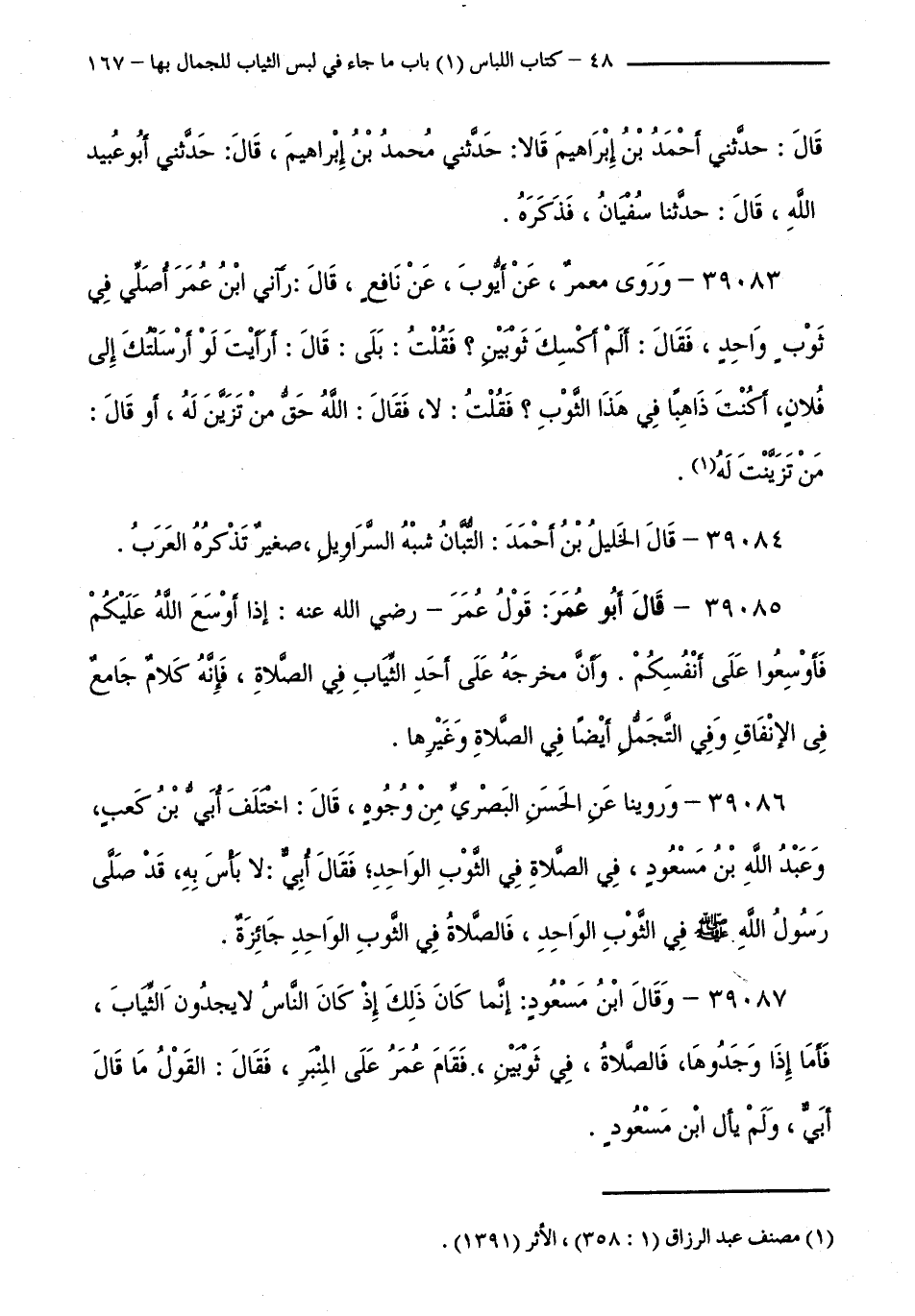 39083 - وَرَوَى مَعْمَرٌ، عَنْ أَيُّوبَ، عَنْ نَافِعٍ قَالَ: رَآنِي ابْنُ عُمَرَ أُصَلِّي فِي ثَوْبٍ وَاحِدٍ، فَقَالَ: أَلَمْ أَكْسُكَ ثَوْبَيْنِ ؟ فَقُلْتُ: بَلَى: قَالَ: أَرَأَيْتَ لَوِ أَرْسَلْتُكَ إِلَى فُلَانٍ، أَكُنْتَ ذَاهِبًا فِي هَذَا الثَّوْبِ ؟ فَقُلْتُ: لَا، فَقَالَ: اللَّهُ حَقُّ مَنْ تَزَيَّنَ لَهُ، أَوْ قَالَ: مَنْ تَزَيَّنْتَ لَهُ.