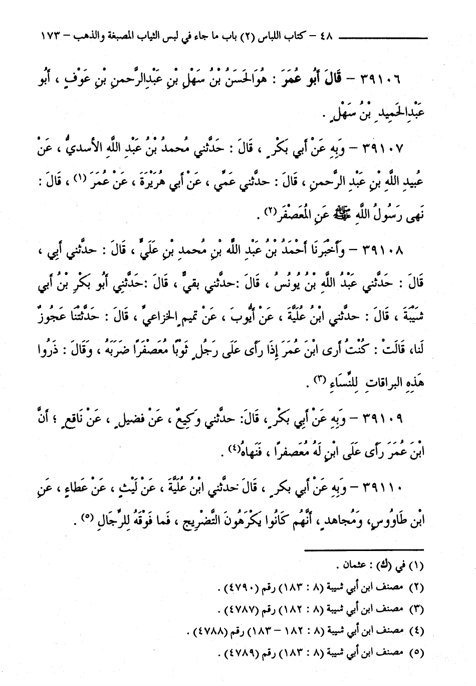 39108 - وَأَخْبَرَنَا أَحْمَدُ بْنُ عَبْدِ اللَّهِ بْنِ مُحَمَّدِ بْنِ عَلِيٍّ قَالَ: حَدَّثَنِي أَبِي قَالَ: حَدَّثَنِي عَبْدُ اللَّهِ بْنُ يُونُسَ قَالَ: حَدَّثَنِي بَقِيٌّ قَالَ: حَدَّثَنِي أَبُو بَكْرِ بْنُ أَبِي شَيْبَةَ قَالَ: حَدَّثَنِي ابْنُ عُلَيَّةَ، عَنْ أَيُّوبَ، عَنْ تَمِيمٍ الْخُزَاعِيِّ قَالَ: حَدَّثَنَا عَجُوزٌ لَنَا، قَالَتْ: كُنْتُ أَرَى ابْنَ عُمَرَ إِذَا رَأَى عَلَى رَجُلٍ ثَوْبًا مُعَصْفَرًا ضَرَبَهُ، وَقَالَ: ذَرُوا هَذِهِ الْبَرَّاقَاتِ لِلنِّسَاءِ.