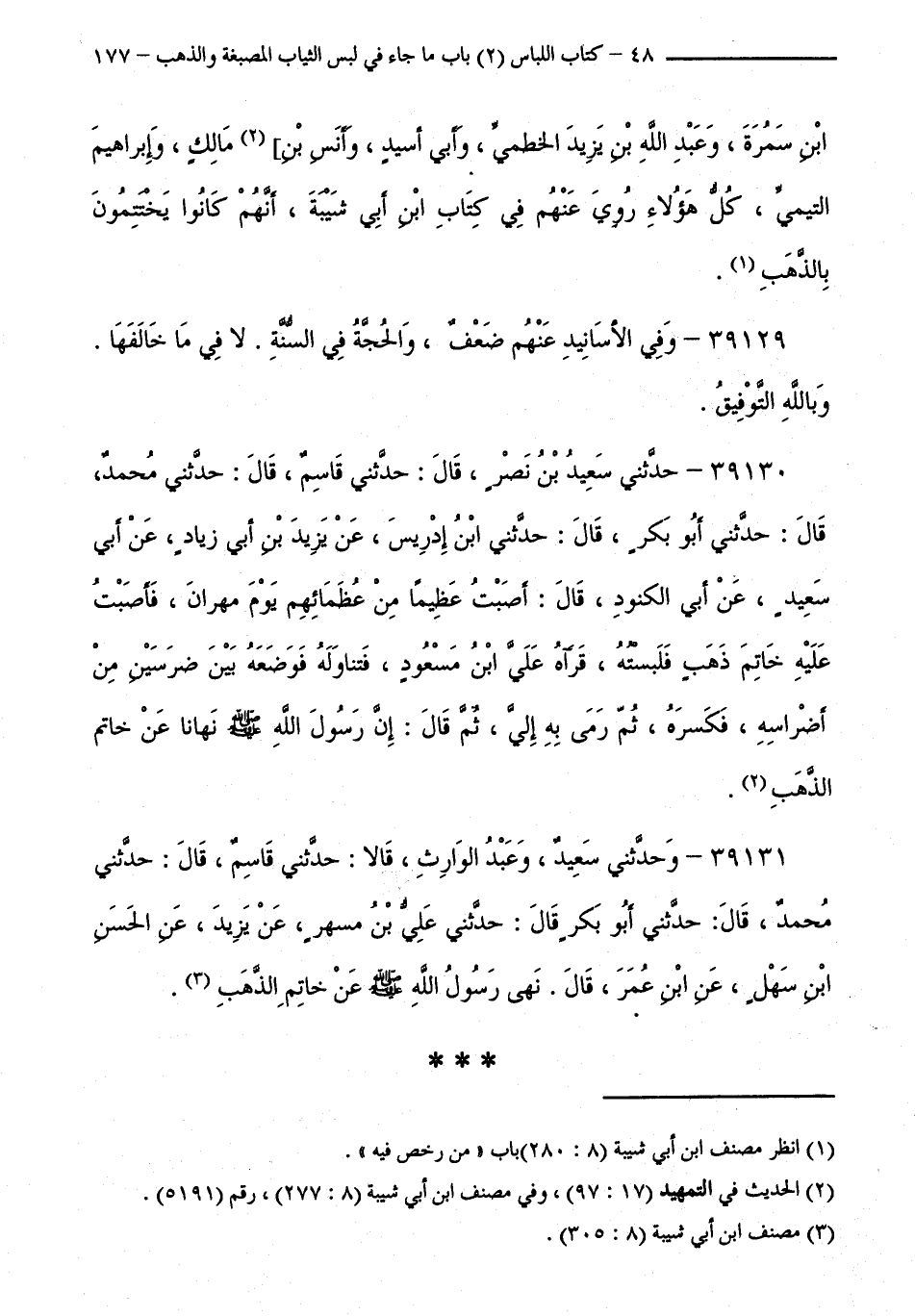 39130 - حَدَّثَنِي سَعِيدُ بْنُ نَصْرٍ قَالَ: حَدَّثَنِي قَاسِمٌ قَالَ: حَدَّثَنِي مُحَمَّدٌ قَالَ: حَدَّثَنِي أَبُو بَكْرٍ قَالَ: حَدَّثَنِي ابْنُ إِدْرِيسَ، عَنْ يَزِيدَ بْنِ أَبِي زِيَادٍ، عَنْ أَبِي سَعِيدٍ، عَنْ أَبِي الْكَنُودِ قَالَ: أَصَبْتُ عَظِيمًا مِنْ عُظَمَائِهِمْ يَوْمَ مِهْرَانَ، فَأَصَبْتُ عَلَيْهِ خَاتَمَ ذَهَبٍ فَلَبِسْتُهُ، فَرَآهُ عَلَيَّ ابْنُ مَسْعُودٍ، فَتَنَاوَلَهُ فَوَضَعَهُ بَيْنَ ضِرْسَيْنِ مِنْ أَضْرَاسِهِ، فَكَسَرَهُ، ثُمَّ رَمَى بِهِ إِلَيَّ، ثُمَّ قَالَ:إِنَّ رَسُولَ اللَّهِ صَلَّى اللَّهُ عَلَيْهِ وَسَلَّمَ نَهَانَا عَنْ خَاتَمِ الذَّهَبِ.