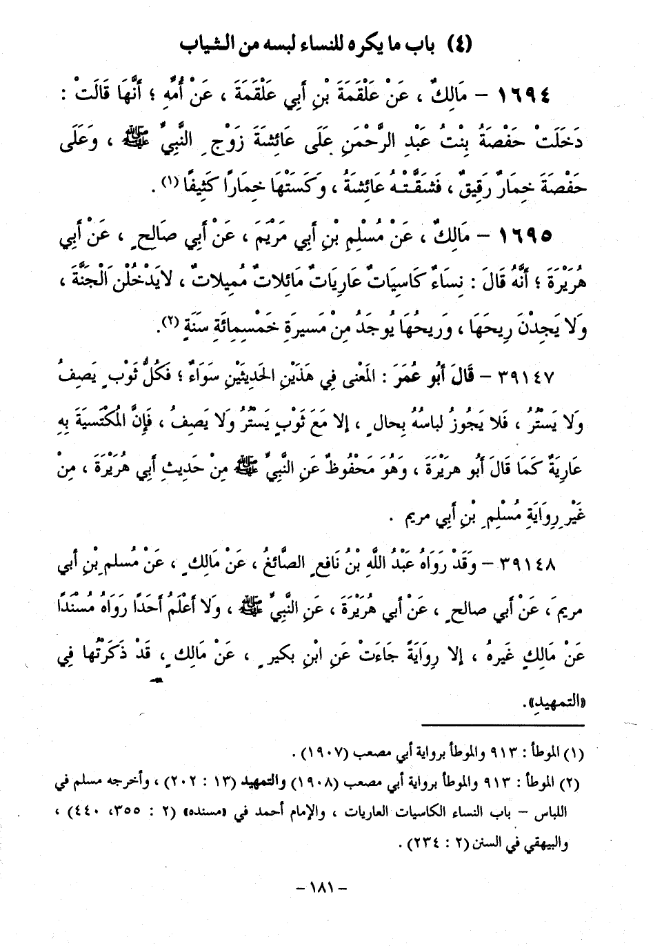 1695 - مَالِكٌ، عَنْ مُسْلِمِ بْنِ أَبِي مَرْيَمَ، عَنْ أَبِي صَالِحٍ، عَنْ أَبِي هُرَيْرَةَ أَنَّهُ قَالَ: نِسَاءٌ كَاسِيَاتٌ عَارِيَاتٌ مَائِلَاتٌ مُمِيلَاتٌ، لَا يَدْخُلْنَ الْجَنَّةَ، وَلَا يَجِدْنَ رِيحَهَا، وَرِيحُهَا يُوجَدُ مِنْ مَسِيرَةِ خَمْسِمِائَةِ سَنَةٍ.