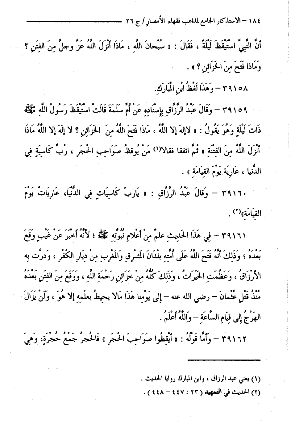 39159 - وَقَالَ عَبْدُ الرَّزَّاقِ بِإِسْنَادِهِ عَنْ أُمِّ سَلَمَةَ قَالَتِاسْتَيْقَظَ رَسُولُ اللَّهِ صَلَّى اللَّهُ عَلَيْهِ وَسَلَّمَ ذَاتَ لَيْلَةٍ وَهُوَ يَقُولُ: " لَا إِلَهَ إِلَّا اللَّهُ، مَاذَا فَتَحَ اللَّهُ مِنَ الْخَزَائِنِ ؟ لَا إِلَهَ إِلَّا اللَّهُ مَاذَا أَنْزَلَ اللَّهُ مِنَ الْفِتْنَةِ " ثُمَّ اتَّفَقَا فَقَالَا مَنْ يُوقِظُ صَوَاحِبَ الْحُجَرِ، رُبَّ كَاسِيَةٍ فِي الدُّنْيَا عَارِيَةٍ يَوْمَ الْقِيَامَةِ ".