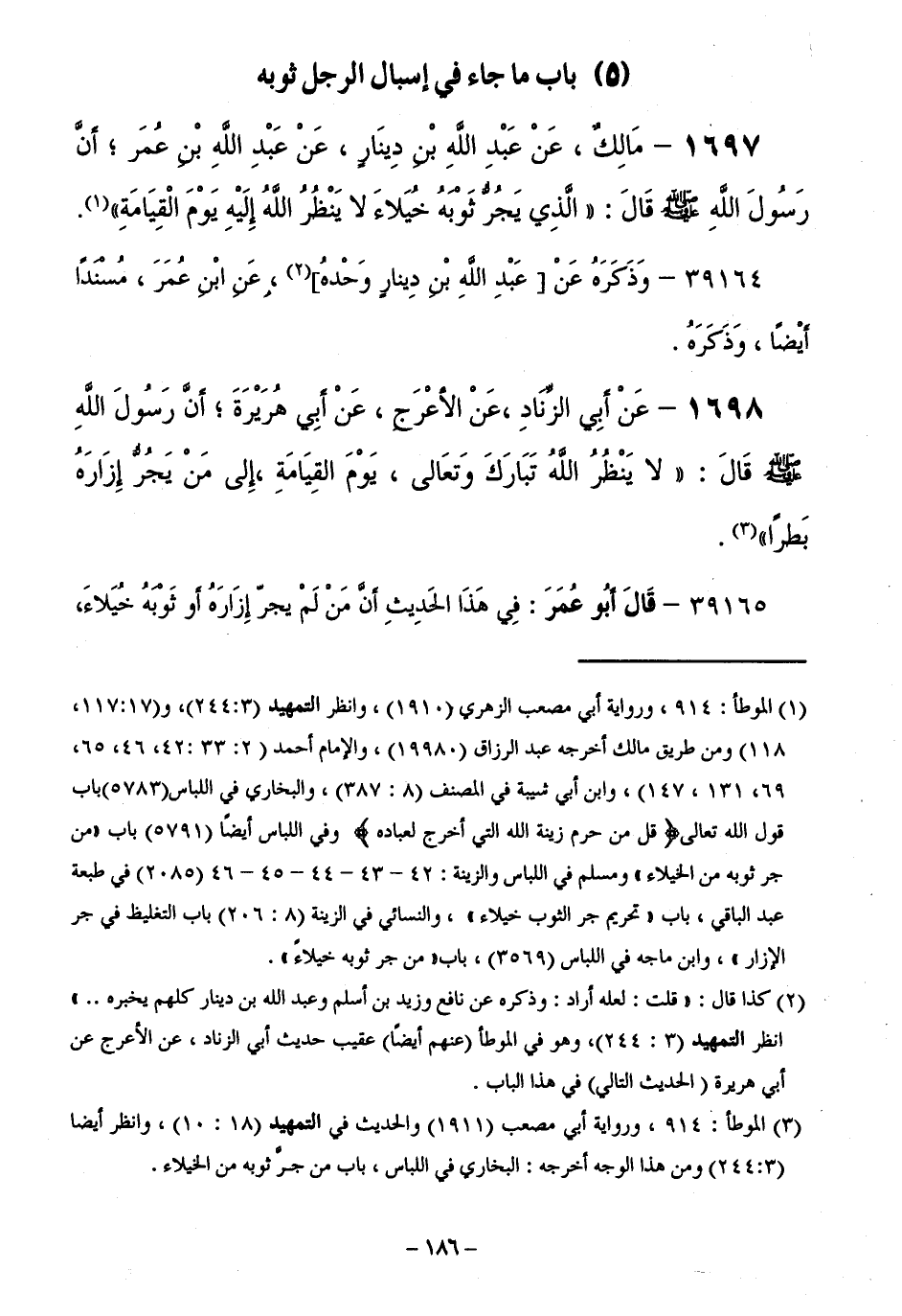 1697 - مَالِكٌ، عَنْ عَبْدِ اللَّهِ بْنِ دِينَارٍ، عَنْ عَبْدِ اللَّهِ بْنِ عُمَرَ أَنَّ رَسُولَ اللَّهِ صَلَّى اللَّهُ عَلَيْهِ وَسَلَّمَ قَالَ: "الَّذِي يَجُرُّ ثَوْبَهُ خُيَلَاءَ لَا يَنْظُرُ اللَّهُ إِلَيْهِ يَوْمَ الْقِيَامَةِ ".