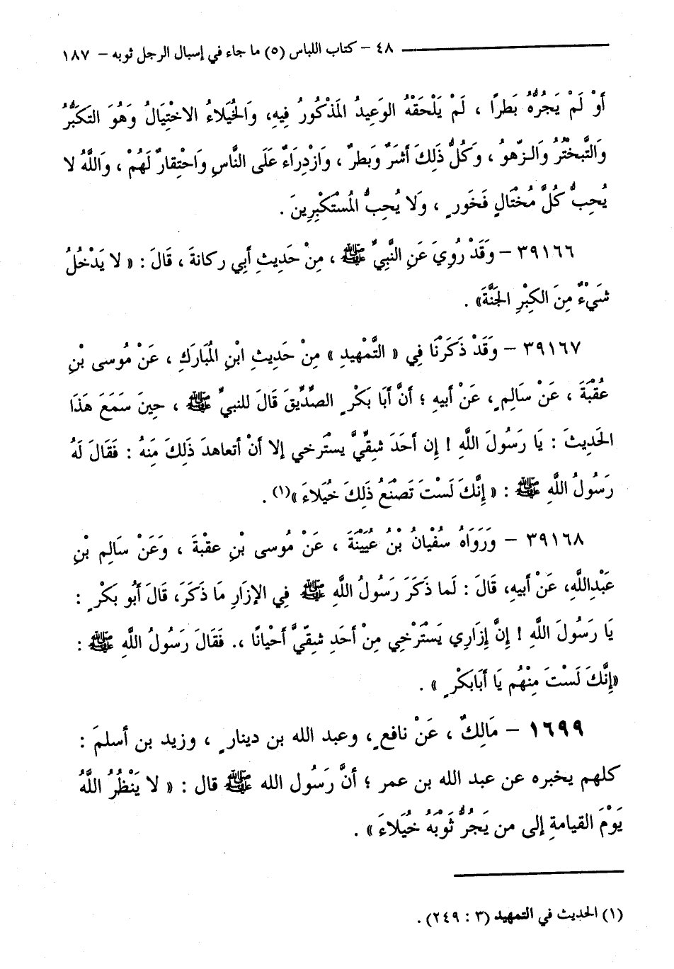 39167 - وَقَدْ ذَكَرْنَا فِي " التَّمْهِيدِ " مِنْ حَدِيثِ ابْنِ الْمُبَارَكِ، عَنْ مُوسَى بْنِ عُقْبَةَ، عَنْ سَالِمٍ، عَنْ أَبِيهِأَنَّ أَبَا بَكْرٍ الصِّدِّيقَ قَالَ لِلنَّبِيِّ صَلَّى اللَّهُ عَلَيْهِ وَسَلَّمَ، حِينَ سَمِعَ هَذَا الْحَدِيثَ: يَا رَسُولَ اللَّهِ ! إِنَّ أَحَدَ شِقَّيَّ يَسْتَرْخِي إِلَّا أَنْ أَتَعَاهَدَ ذَلِكَ مِنْهُ: فَقَالَ لَهُ رَسُولُ اللَّهِ صَلَّى اللَّهُ عَلَيْهِ وَسَلَّمَ: " إِنَّكَ لَسْتَ تَصْنَعُ ذَلِكَ خُيَلَاءَ ".