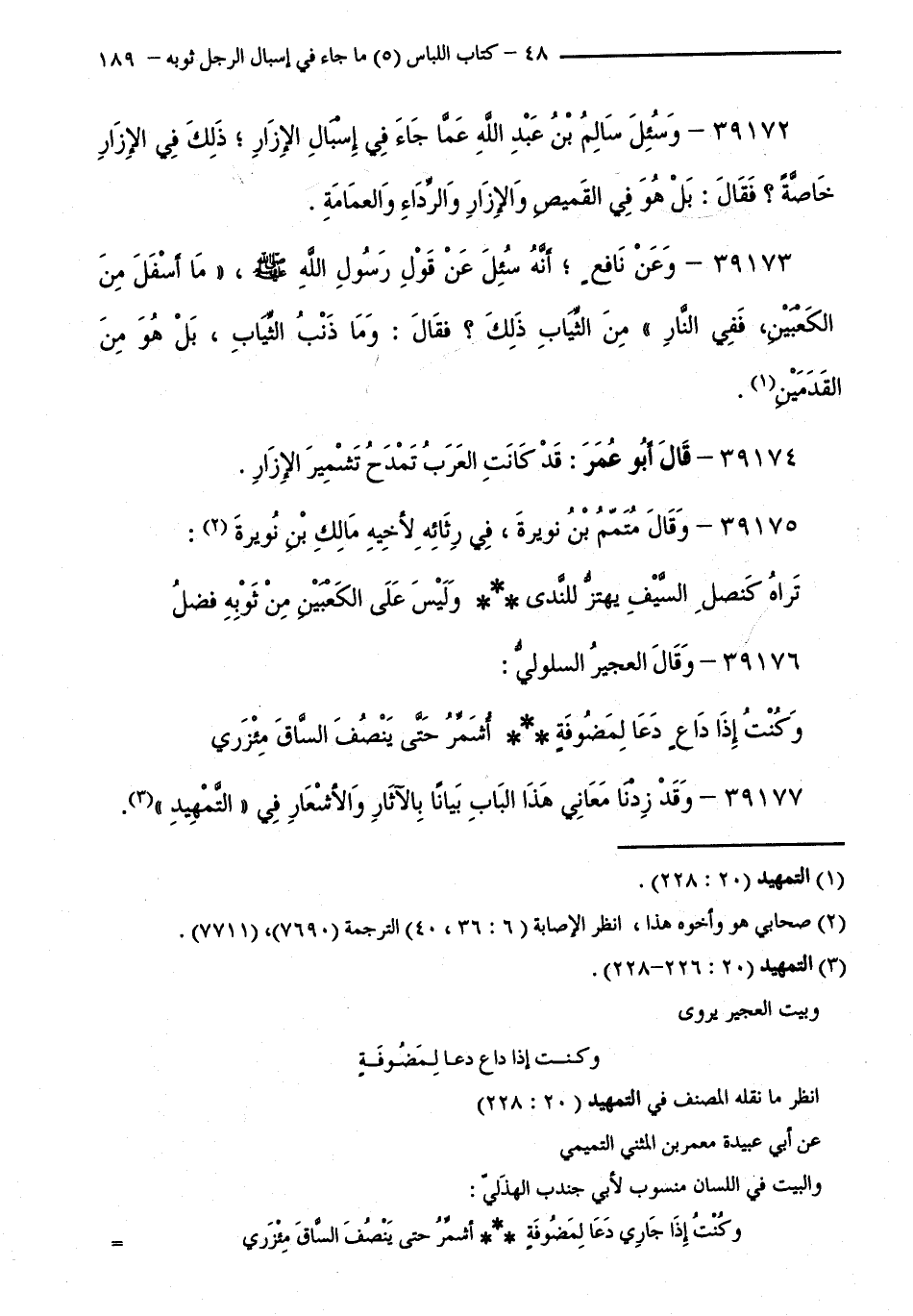 39174 - قَالَ أَبُو عُمَرَ: قَدْ كَانَتِ الْعَرَبُ تَمْدَحُ تَشْمِيرَ الْإِزَارِ.