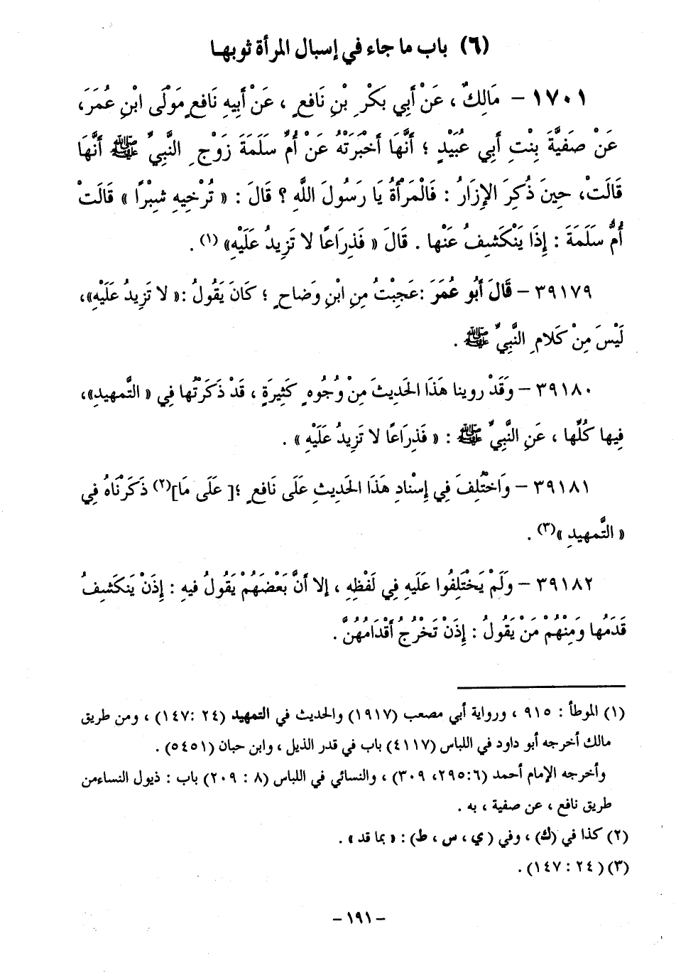 1701 - مَالِكٌ، عَنْ أَبِي بَكْرِ بْنِ نَافِعٍ، عَنْ أَبِيهِ نَافِعٍ مَوْلَى ابْنِ عُمَرَ، عَنْ صَفِيَّةَ بِنْتِ أَبِي عُبَيْدٍ أَنَّهَا أَخْبَرَتْهُعَنْ أُمِّ سَلَمَةَ زَوْجِ النَّبِيِّ صَلَّى اللَّهُ عَلَيْهِ وَسَلَّمَ أَنَّهَا قَالَتْ، حِينَ ذُكِرَ الْإِزَارُ: فَالْمَرْأَةُ يَا رَسُولَ اللَّهِ ؟ قَالَ: تُرْخِيهِ شِبْرًا " قَالَتْ أُمُّ سَلَمَةَ: إِذًا يَنْكَشِفُ عَنْهَا. قَالَ " فِذِرَاعًا لَا تَزِيدُ عَلَيْهِ ".