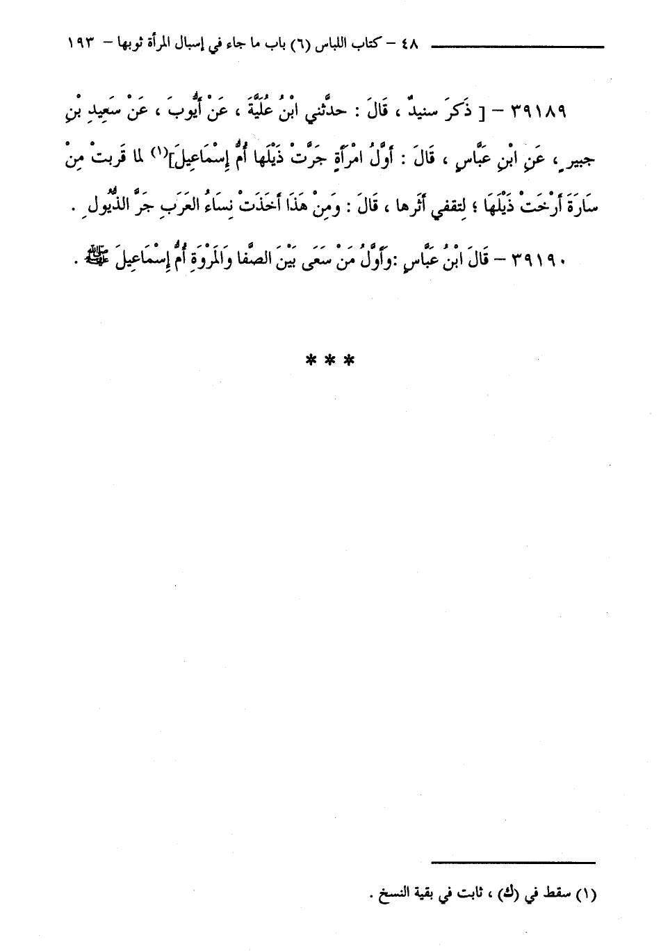 39189 - [ ذَكَرَ سُنَيْدٌ قَالَ: حَدَّثَنِي ابْنُ عُلَيَّةَ، عَنْ أَيُّوبَ، عَنْ سَعِيدِ بْنِ جُبَيْرٍ، عَنِ ابْنِ عَبَّاسٍ قَالَ: أَوَّلُ امْرَأَةٍ جَرَّتْ ذَيْلَهَا أُمُّ إِسْمَاعِيلَ ] لَمَّا قَرُبَتْ مِنْ سَارَّةَ أَرْخَتْ ذَيْلَهَا لِتَقْفِيَ أَثَرَهَا قَالَ: وَمِنْ هَذَا أَخَذَتْ نِسَاءُ الْعَرَبِ جَرَّ الذُّيُولِ.