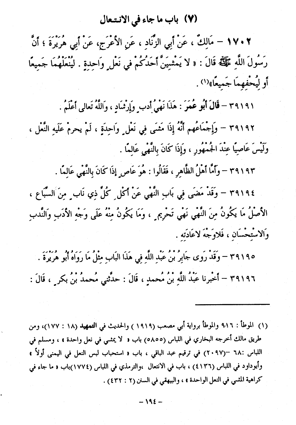 1702 - مَالِكٌ، عَنْ أَبِي الزِّنَادِ، عَنِ الْأَعْرَجِ، عَنْ أَبِي هُرَيْرَةَ أَنَّ رَسُولَ اللَّهِ صَلَّى اللَّهُ عَلَيْهِ وَسَلَّمَ قَالَ: "لَا يَمْشِيَنَّ أَحَدُكُمْ فِي نَعْلٍ وَاحِدَةٍ. لِيَنْعَلْهُمَا جَمِيعًا أَوْ لِيُحْفِهِمَا جَمِيعًا ".