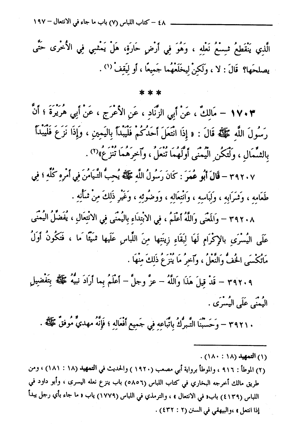 1703 - مَالِكٌ، عَنْ أَبِي الزِّنَادِ، عَنِ الْأَعْرَجِ، عَنْ أَبِي هُرَيْرَةَ أَنَّ رَسُولَ اللَّهِ صَلَّى اللَّهُ عَلَيْهِ وَسَلَّمَ قَالَ: "إِذَا انْتَعَلَ أَحَدُكُمْ فَلْيَبْدَأُ بِالْيَمِينِ، وَإِذَا نَزَعَ فَلْيَبْدَأْ بِالشِّمَالِ، وَلْتَكُنِ الْيُمْنَى أَوَّلَهُمَا تُنْعَلُ، وَآخِرُهُمَا تُنْزَعُ ".