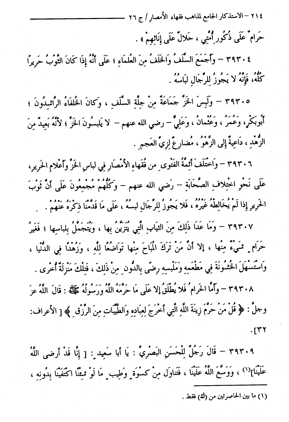 39305 - وَلَبِسَ الْخَزَّ جَمَاعَةٌ مِنْ جُلَّةِ السَّلَفِ، وَكَانَ الْخُلَفَاءُ الرَّاشِدُونَ أَبُو بَكْرٍ، وَعُمَرُ، وَعُثْمَانُ، وَعَلِيٌّ - رَضِيَ اللَّهُ عَنْهُمْ - لَا يَلْبَسُونَ الْخَزَّ لِأَنَّهُ بَعِيدٌ مِنَ الزُّهْدِ، دَاعِيَةٌ إِلَى الزَّهْوِ، مُضَارِعٌ لِزِيِّ الْعَجَمِ.