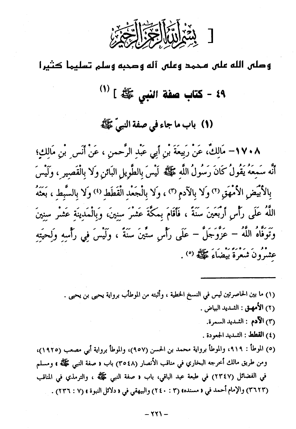 1708 - مَالِكٌ، عَنْ رَبِيعَةَ بْنِ أَبِي عَبْدِ الرَّحْمَنِ، عَنْ أَنَسِ بْنِ مَالِكٍ أَنَّهُ سَمِعَهُ يَقُولُكَانَ رَسُولُ اللَّهِ صَلَّى اللَّهُ عَلَيْهِ وَسَلَّمَ لَيْسَ بِالطَّوِيلِ الْبَائِنِ وَلَا بِالْقَصِيرِ، وَلَيْسَ بِالْأَبْيَضِ الْأَمْهَقِ وَلَا بِالْآدَمِ، وَلَا بِالْجَعْدِ الْقَطَطِ وَلَا بِالسَّبْطِ، بَعَثَهُ اللَّهُ عَلَى رَأْسِ أَرْبَعِينَ سَنَةً، فَأَقَامَ بِمَكَّةَ عَشْرَ سِنِينَ، وَبِالْمَدِينَةِ عَشْرَ سِنِينَ وَتَوَفَّاهُ اللَّهُ - عَزَّ وَجَلَّ - عَلَى رَأْسَ سِتِّينَ سَنَةً، وَلَيْسَ فِي رَأْسِهِ وَلِحْيَتِهِ عِشْرُونَ شَعْرَةً بَيْضَاءَ صَلَّى اللَّهُ عَلَيْهِ وَسَلَّمَ.