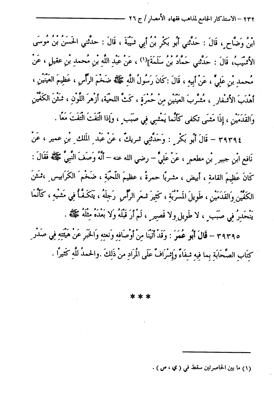 ابْنُ وَضَّاحٍ قَالَ: حَدَّثَنِي أَبُو بَكْرِ بْنُ أَبِي شَيْبَةَ قَالَ: حَدَّثَنِي الْحَسَنُ بْنُ مُوسَى الْأَشْيَبُ قَالَ: حَدَّثَنِي حَمَّادُ بْنُ سَلَمَةَ ]، عَنْ عَبْدِ اللَّهِ بْنِ مُحَمَّدِ بْنِ عُقَيْلٍ، عَنْ مُحَمَّدِ بْنِ عَلِيٍّ، عَنْ أَبِيهِ قَالَ:كَانَ رَسُولُ اللَّهِ صَلَّى اللَّهُ عَلَيْهِ وَسَلَّمَ ضَخْمَ الرَّأْسِ، عَظِيمَ الْعَيْنَيْنِ أَهْدَبَ الْأَشْفَارِ، مُشَرَّبَ الْعَيْنَيْنِ مِنْ حُمْرَةٍ، كَثَّ اللِّحْيَةِ، أَزْهَرَ اللَّوْنِ، شَثْنَ الْكَفَّيْنِ وَالْقَدَمَيْنِ، إِذَا مَشَى تَكَفَّأَ كَأَنَّمَا يَمْشِي فِي صَبَبٍ، وَإِذَا الْتَفَتَ الْتَفَتَ مَعًا.