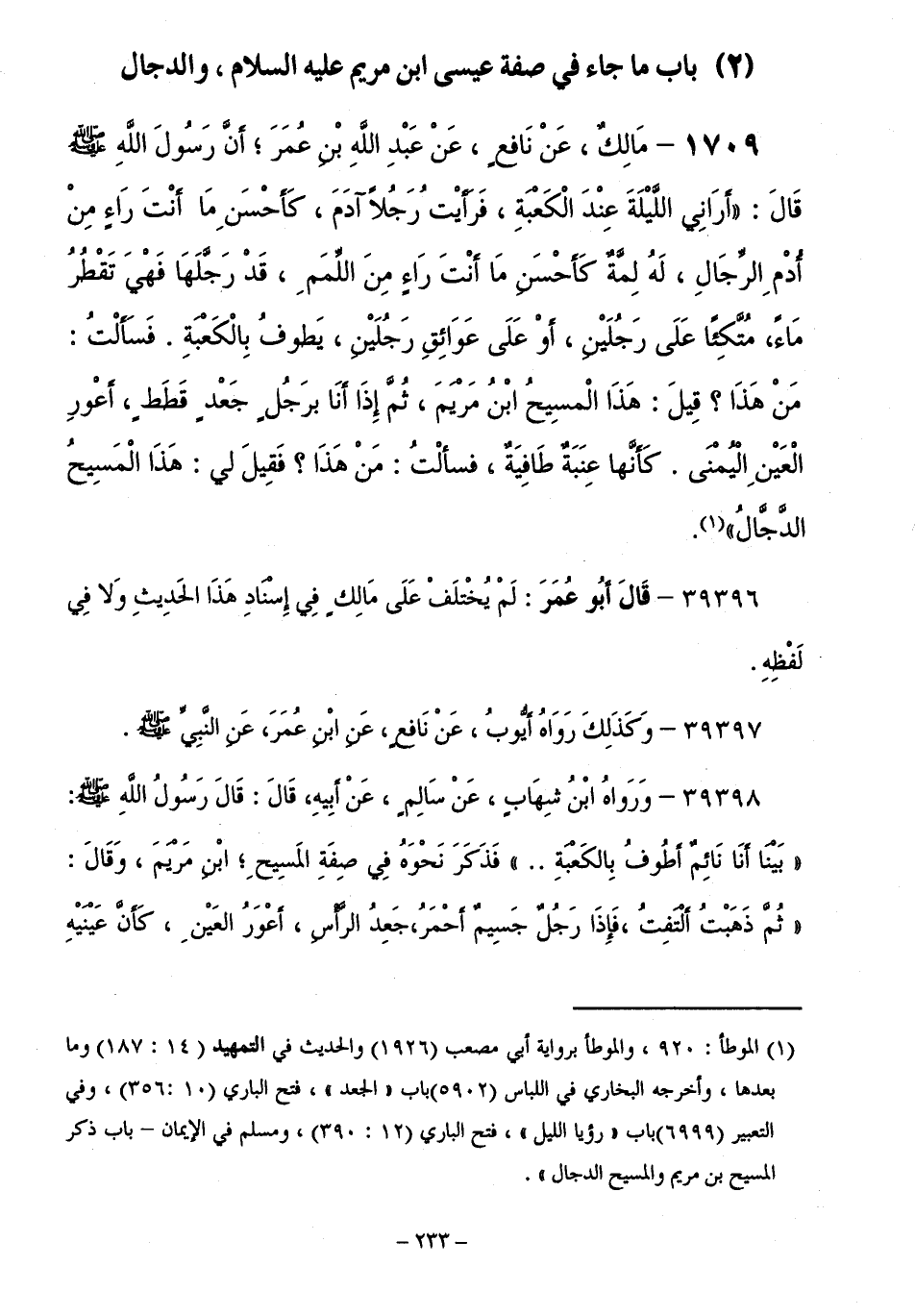 1709 - مَالِكٌ، عَنْ نَافِعٍ، عَنْ عَبْدِ اللَّهِ بْنِ عُمَرَأَنَّ رَسُولَ اللَّهِ صَلَّى اللَّهُ عَلَيْهِ وَسَلَّمَ قَالَ: " أَرَانِي اللَّيْلَةَ عِنْدَ الْكَعْبَةِ، فَرَأَيْتُ رَجُلًا آدَمَ، كَأَحْسَنِ مَا أَنْتَ رَاءٍ مِنْ أُدْمِ الرِّجَالِ، لَهُ لُمَّةٌ كَأَحْسَنِ مَا أَنْتَ رَاءٍ مِنَ اللِّمَمِ، قَدْ رَجَّلَهَا فَهِيَ تَقْطُرُ مَاءً، مُتَّكِئًا عَلَى رَجُلَيْنِ، أَوْ عَلَى عَوَاتِقِ رَجُلَيْنِ، يَطُوفُ بِالْكَعْبَةِ، فَسَأَلْتُ: مَنْ هَذَا ؟ قِيلَ: هَذَا الْمَسِيحُ ابْنُ مَرْيَمَ، ثُمَّ إِذَا أَنَا بَرْجَلٍ جَعْدٍ قَطَطٍ، أَعْوَرِ الْعَيْنِ الْيُمْنَى. كَأَنَّهَا عِنَبَةٌ طَافِيَةٌ، فَسَأَلْتُ مَنْ هَذَا ؟ فَقِيلَ لِي: هَذَا الْمَسِيحُالدَّجَّالُ ".