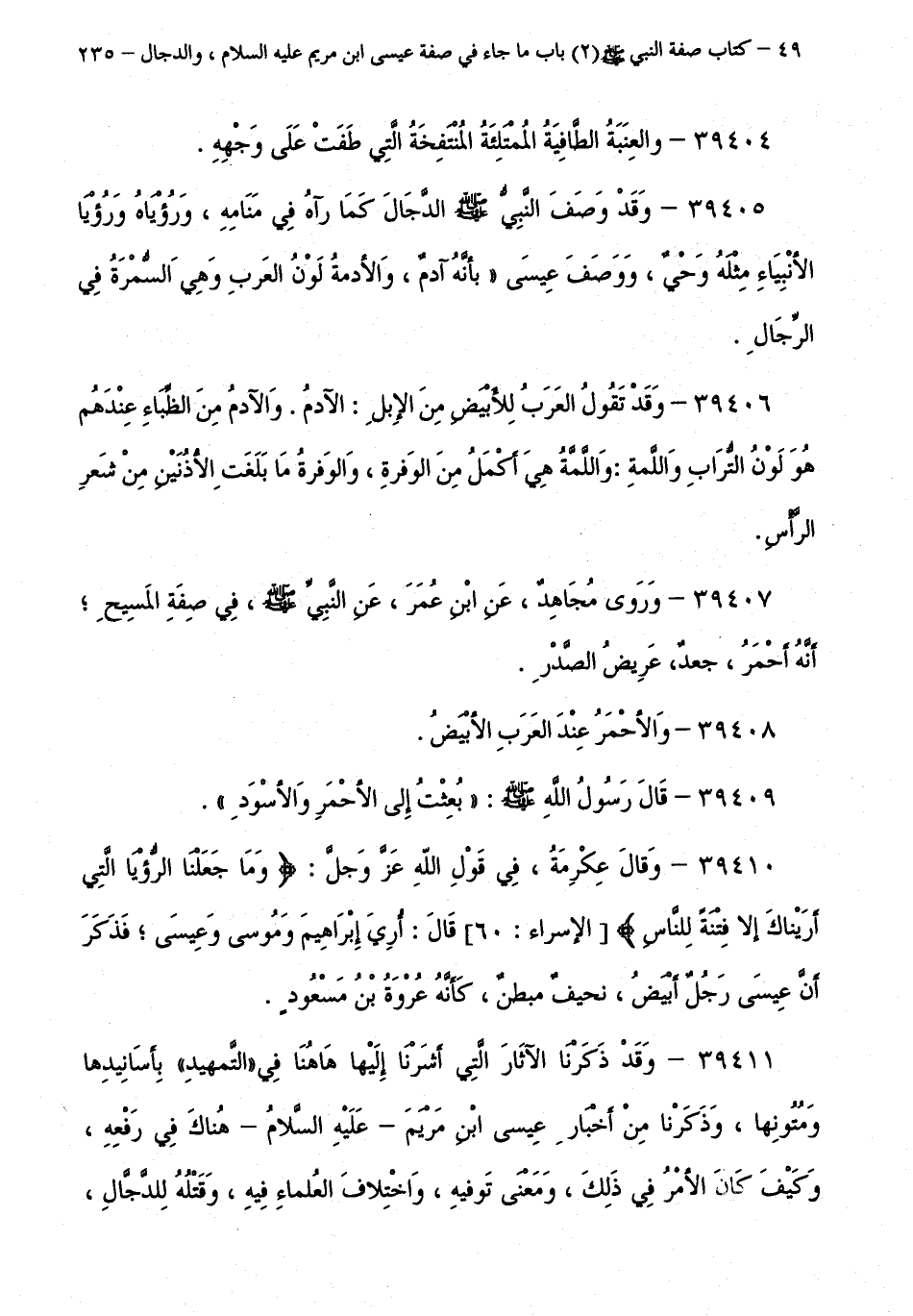 39411 - وَقَدْ ذَكَرْنَا الْآثَارَ الَّتِي أَشَرْنَا إِلَيْهَا هَاهُنَا فِي " التَّمْهِيدِ " بِأَسَانِيدِهَا وَمُتُونِهَا، وَذَكَرْنَا مِنْ أَخْبَارِ عِيسَى ابْنِ مَرْيَمَ - عَلَيْهِ السَّلَامُ - هُنَاكَ فِي رَفْعِهِ، وَكَيْفَ كَانَ الْأَمْرُ فِي ذَلِكَ، وَمَعْنَى تَوَفِّيهِ، وَاخْتِلَافُ الْعُلَمَاءِ فِيهِ، وَقَتْلُهُ لِلدَّجَّالِ،
