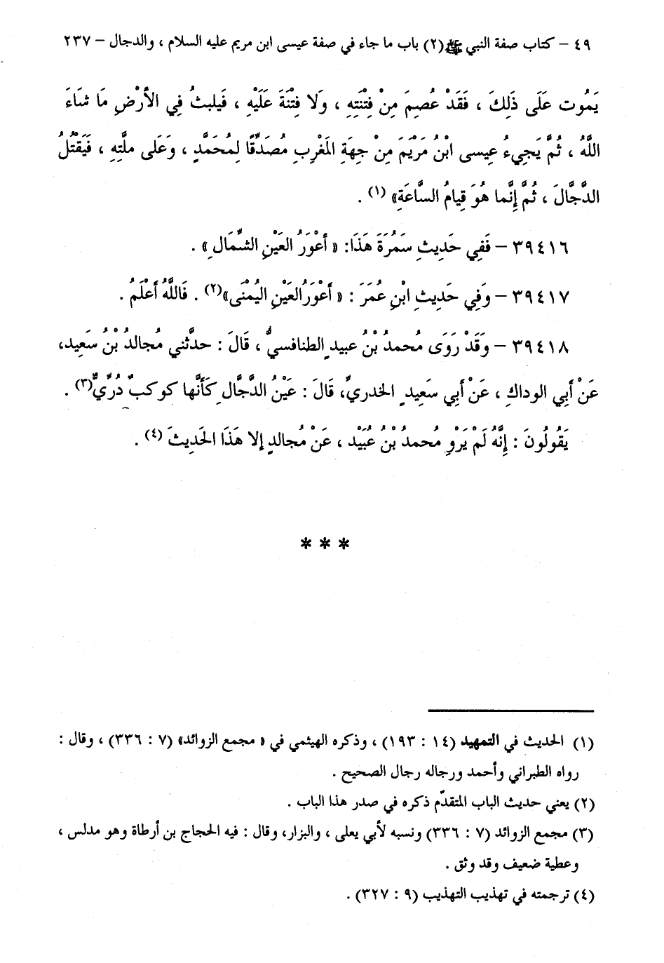39418 - وَقَدْ رَوَى مُحَمَّدُ بْنُ عُبَيْدٍ الطَّنَافِسِيُّ قَالَ: حَدَّثَنِي مُجَالِدُ بْنُ سَعِيدٍ، عَنْ أَبِي الْوَدَّاكِ، عَنْ أَبِي سَعِيدٍ الْخُدْرِيِّ قَالَ: عَيْنُ الدَّجَّالِ كَأَنَّهَا كَوْكَبٌ دُرِّيٌّ. يَقُولُونَ: إِنَّهُ لَمْ يَرْوِ مُحَمَّدُ بْنُ عُبَيْدٍ، عَنْ مُجَالِدٍ إِلَّا هَذَا الْحَدِيثَ.