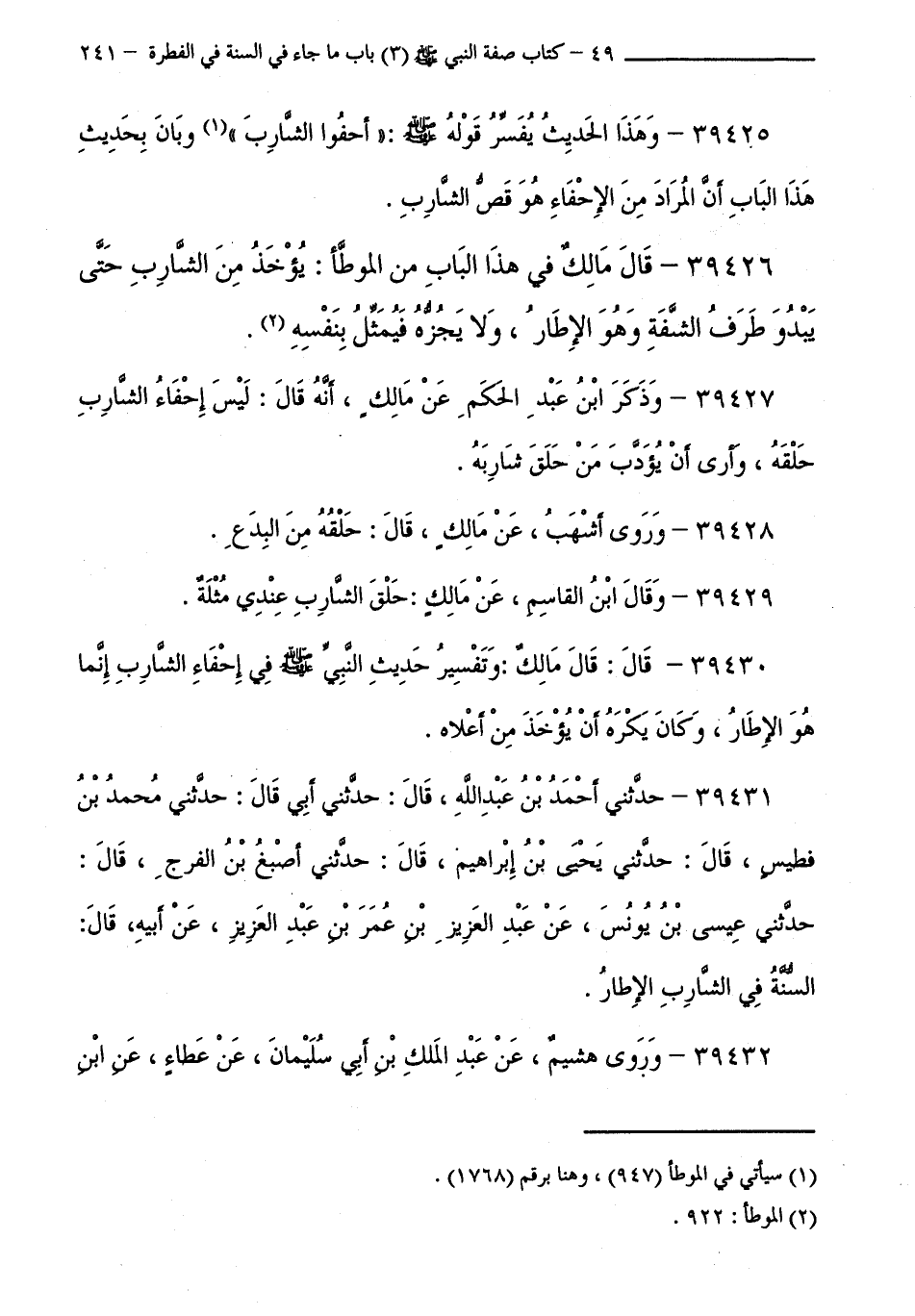 39430 - قَالَ: قَالَ مَالِكٌ: وَتَفْسِيرُ حَدِيثِ النَّبِيِّ صَلَّى اللَّهُ عَلَيْهِ وَسَلَّمَ فِي إِحْفَاءِ الشَّارِبِ إِنَّمَا هُوَ الْإِطَارُ، وَكَانَ يَكْرَهُ أَنْ يُؤْخَذَ مِنْ أَعْلَاهُ.