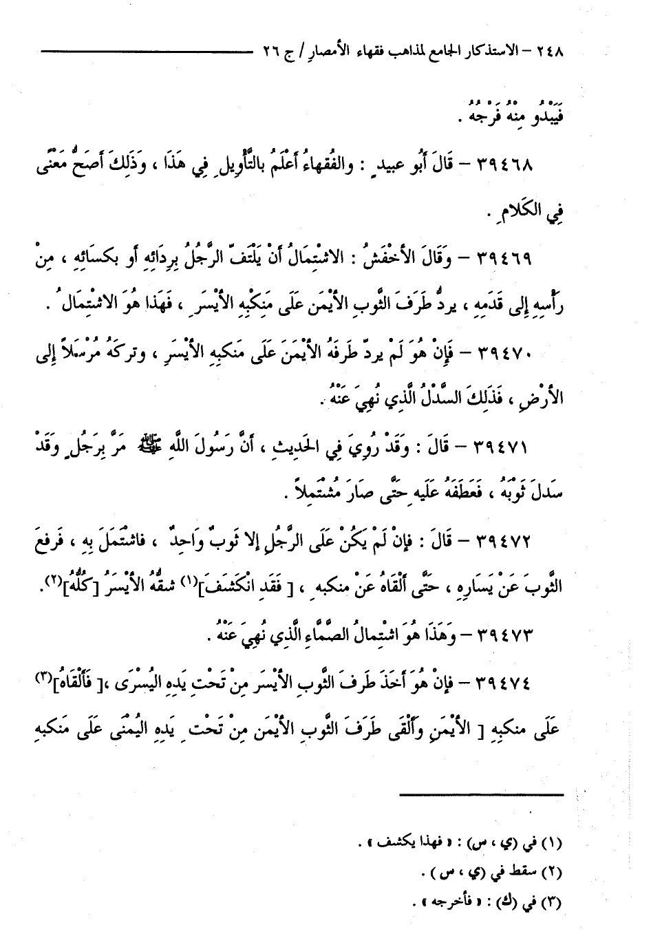 39471 - قَالَ: وَقَدْ رُوِيَ فِي الْحَدِيثِأَنَّ رَسُولَ اللَّهِ صَلَّى اللَّهُ عَلَيْهِ وَسَلَّمَ مَرَّ بِرَجُلٍ وَقَدْ سَدَلَ ثَوْبَهُ، فَعَطَفَهُ عَلَيْهِ حَتَّى صَارَ مُشْتَمِلًا.