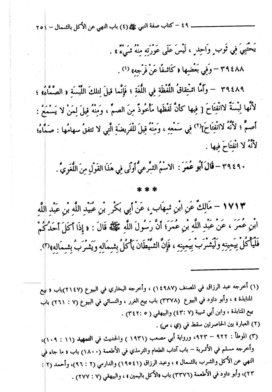 1713 - مَالِكٌ عَنِ ابْنِ شِهَابٍ، عَنْ أَبِي بَكْرِ بْنِ عُبَيْدِ اللَّهِ بْنِ عَبْدِ اللَّهِ بْنِ عُمَرَ، عَنْ عَبْدِ اللَّهِ بْنِ عُمَرَ أَنَّ رَسُولَ اللَّهِ صَلَّى اللَّهُ عَلَيْهِ وَسَلَّمَ قَالَ: "إِذَا أَكَلَ أَحَدُكُمْ فَلْيَأْكُلْ بِيَمِينِهِ وَلْيَشْرَبْ بِيَمِينِهِ، فَإِنَّ الشَّيْطَانَ يَأْكُلُ بِشِمَالِهِ وَيَشْرَبُ بِشِمَالِهِ ".