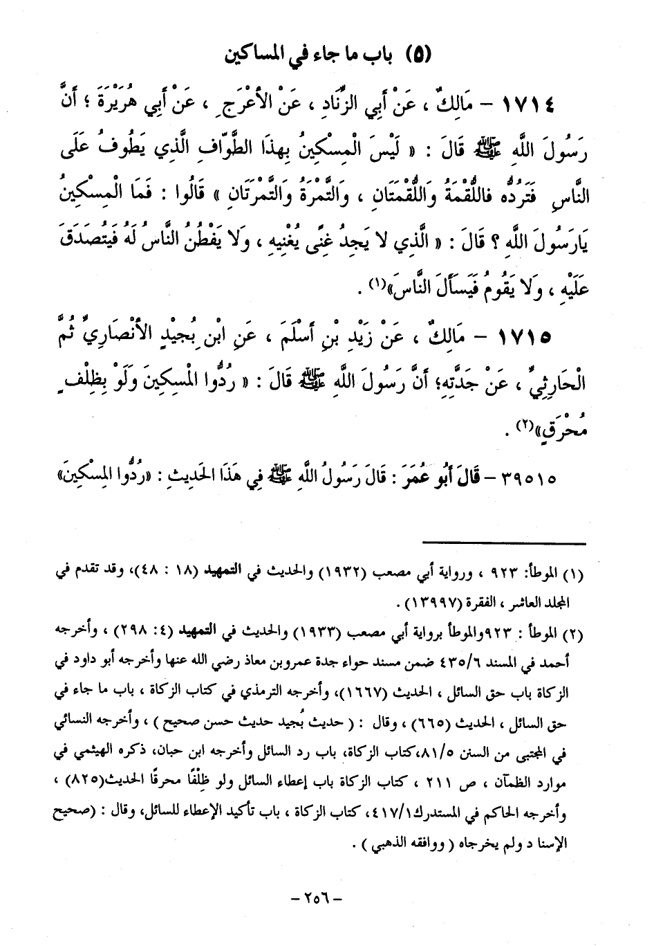 1714 - مَالِكٌ، عَنْ أَبِي الزِّنَادِ، عَنِ الْأَعْرَجِ، عَنْ أَبِي هُرَيْرَةَ أَنَّ رَسُولَ اللَّهِ صَلَّى اللَّهُ عَلَيْهِ وَسَلَّمَ قَالَ: "لَيْسَ الْمِسْكِينُ بِهَذَا الطَّوَّافِ الَّذِي يَطُوفُ عَلَى النَّاسِ فَتَرُدُّهُ فَاللُّقْمَةُ وَاللُّقْمَتَانِ، وَالتَّمْرَةُ وَالتَّمْرَتَانِ " قَالُوا: فَمَا الْمِسْكِينُ يَا رَسُولَ اللَّهِ ؟ قَالَ: " الَّذِي لَا يَجِدُ غَنًى يُغْنِيهِ، وَلَا يَفْطَنُ النَّاسُ لَهُ فَيُتَصَدَّقُ عَلَيْهِ، وَلَا يَقُومُ فَيَسْأَلُ النَّاسَ ".