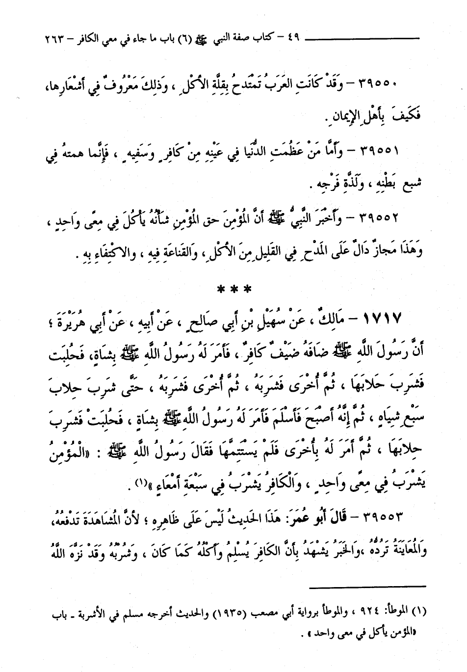 1717 - مَالِكٌ، عَنْ سُهَيْلِ بْنِ أَبِي صَالِحٍ، عَنْ أَبِيهِ، عَنْ أَبِي هُرَيْرَةَأَنَّ رَسُولَ اللَّهِ صَلَّى اللَّهُ عَلَيْهِ وَسَلَّمَ ضَافَهُ ضَيْفٌ كَافِرٌ، فَأَمَرَ لَهُ رَسُولُ اللَّهِ صَلَّى اللَّهُ عَلَيْهِ وَسَلَّمَ بِشَاةٍ، فَحُلِبَتْ فَشَرِبَ حِلَابَهَا، ثُمَّ أُخْرَى فَشَرِبَهُ، ثُمَّ أُخْرَى فَشَرِبَهُ، حَتَّى شَرِبَ حِلَابَ سَبْعِ شِيَاهٍ، ثُمَّ إِنَّهُ أَصْبَحَ فَأَسْلَمَ فَأَمَرَ لَهُ رَسُولُ اللَّهِ صَلَّى اللَّهُ عَلَيْهِ وَسَلَّمَ بِشَاةٍ، فَحُلِبَتْ فَشَرِبَ حِلَابَهَا، ثُمَّ أَمَرَ لَهُ بِأُخْرَى فَلَمْ يَسْتَتِمَّهَا فَقَالَ رَسُولُ اللَّهِ صَلَّى اللَّهُ عَلَيْهِ وَسَلَّمَ: " الْمُؤْمِنُ يَشْرَبُ فِي مِعًى وَاحِدٍ، وَالْكَافِرُ يَشْرَبُ فِي سَبْعَةِ أَمْعَاءٍ ".