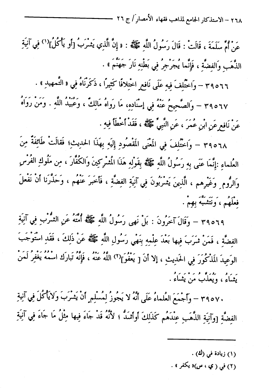 39569 - وَقَالَ آخَرُونَ: بَلْ نَهَى رَسُولُ اللَّهِ صَلَّى اللَّهُ عَلَيْهِ وَسَلَّمَ أُمَّتَهُ عَنِ الشُّرْبِ فِي آنِيَةِ الْفِضَّةِ، فَمَنْ شَرِبَ فِيهَا بَعْدَ عِلْمِهِ بِنَهْيِ رَسُولِ اللَّهِ صَلَّى اللَّهُ عَلَيْهِ وَسَلَّمَ عَنْ ذَلِكَ، فَقَدِ اسْتَوْجَبَ الْوَعِيدَ الْمَذْكُورَ فِي الْحَدِيثِ، إِلَّا أَنْ [ يَعْفُوَ ] اللَّهُ عَنْهُ، فَإِنَّهُ تَبَارَكَ اسْمُهُ يَغْفِرُ لِمَنْ يَشَاءُ، وَيُعَذِّبُ مَنْ يَشَاءُ.