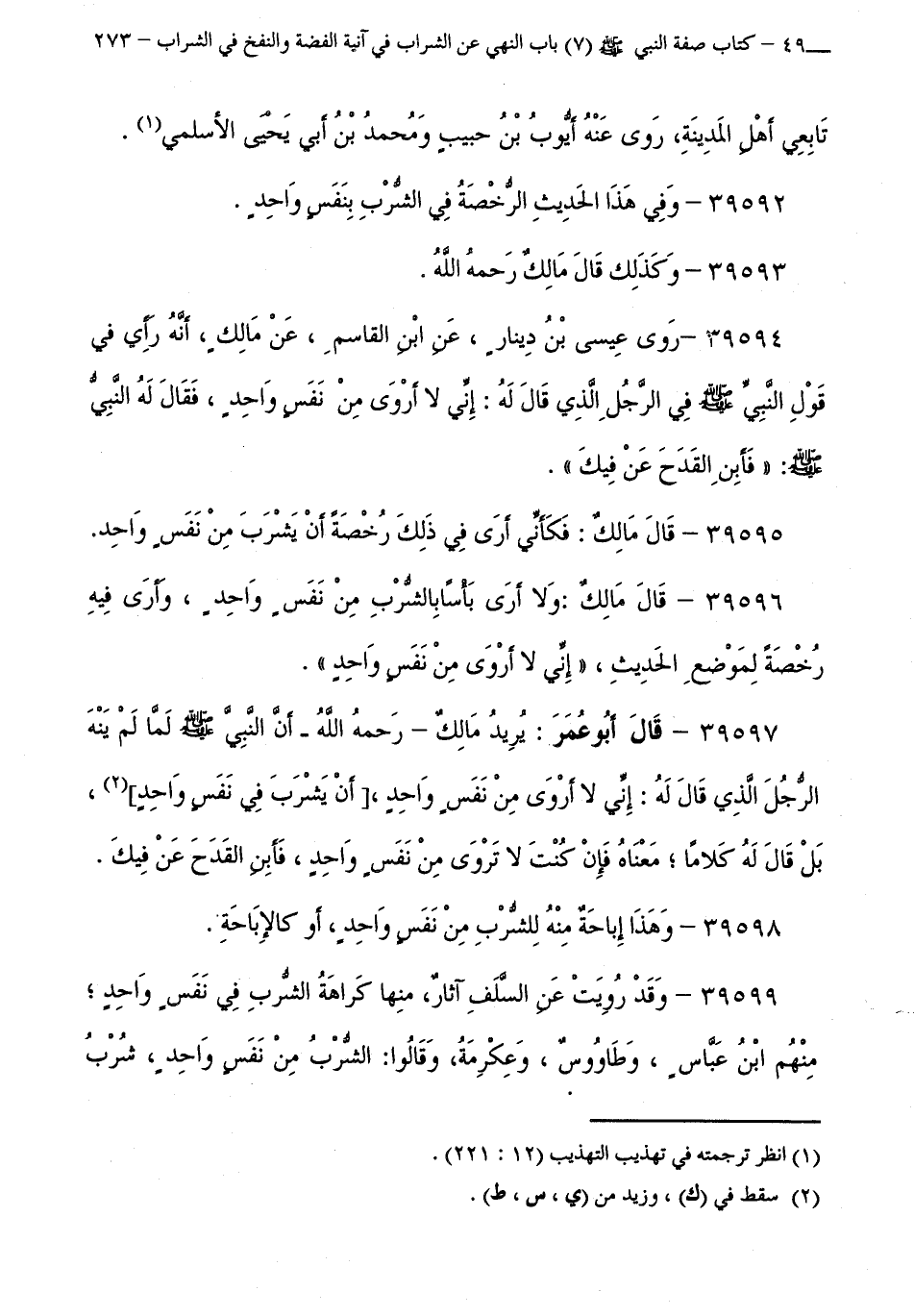 39597 - قَالَ أَبُو عُمَرَ: يُرِيدُ مَالِكٌ - رَحِمَهُ اللَّهُ - أَنَّ النَّبِيَّ صَلَّى اللَّهُ عَلَيْهِ وَسَلَّمَ لَمَّا لَمْ يَنْهَ الرَّجُلَ الَّذِي قَالَ لَهُ:إِنِّي لَا أَرْوَى مِنْ نَفَسٍ وَاحِدٍ، [ أَنْ يَشْرَبَ فِي نَفَسٍ وَاحِدٍ ]، بَلْ قَالَ لَهُ كَلَامًا مَعْنَاهُ فَإِنْ كُنْتَ لَا تُرْوَى مِنْ نَفَسٍ وَاحِدٍ، فَأَبِنِ الْقَدَحَ عَنْ فِيكَ.
